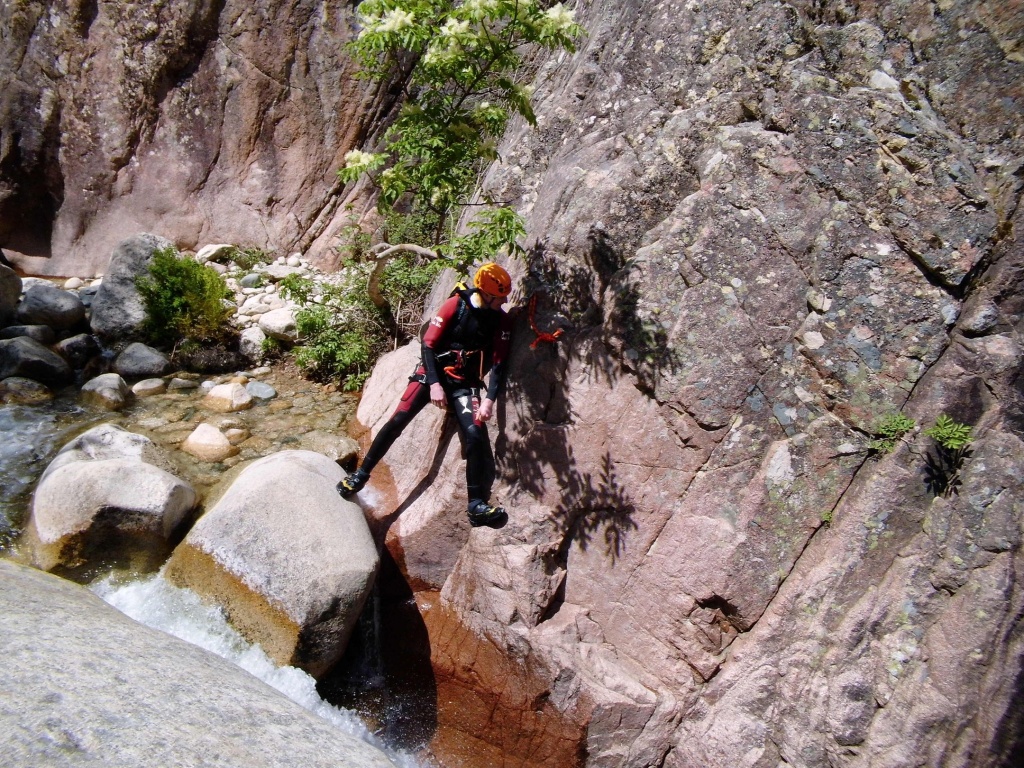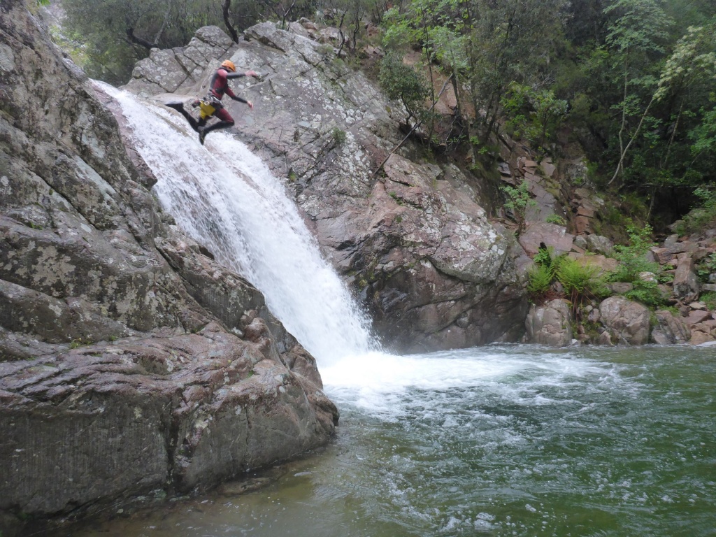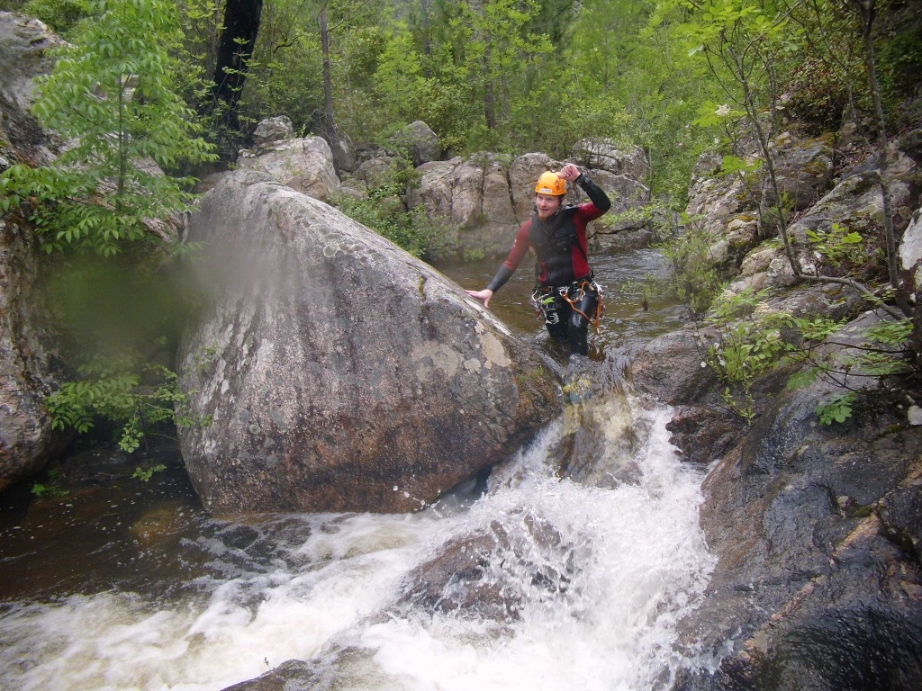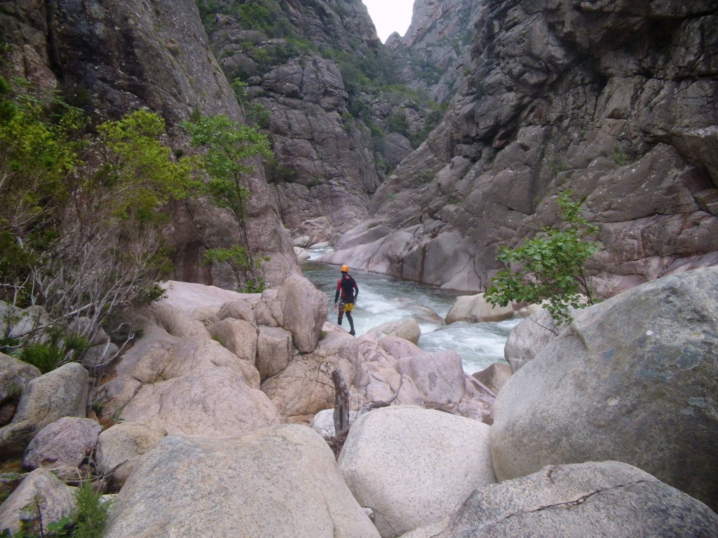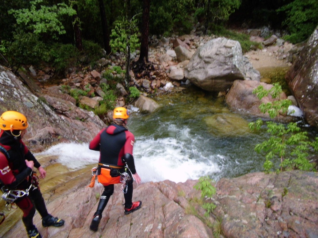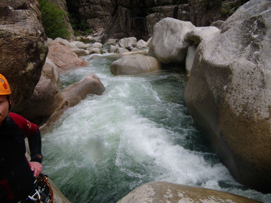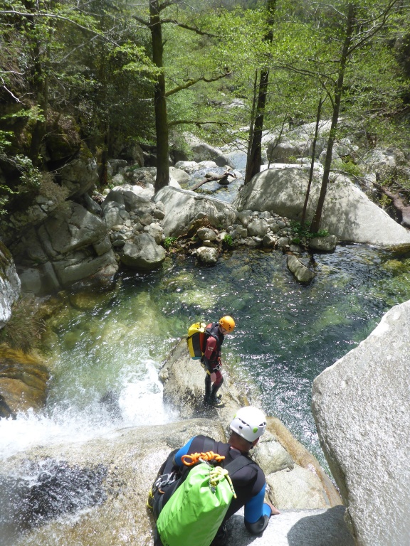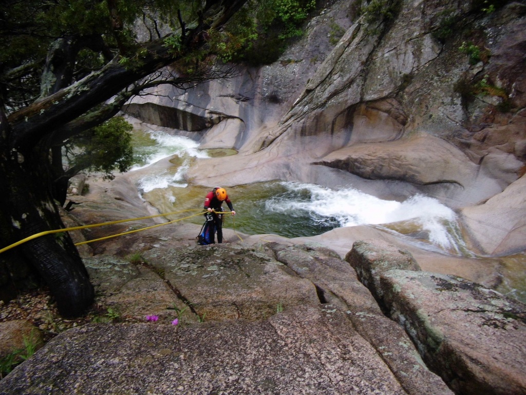 Als Alternativtour für diejenigen die in der Vacca noch nicht müde wurden sind wir in einem Fluß gegangen, an dem wir die Tage zuvor immer wieder Leute gesehen hatten, welcher uns aber nicht bekannt war. Um den Fluss zu erreichen fährt man von Solenzara in Richtung Bavella Pass und dann wo auf der rechten Seite der Ciuffatu rauskommt geht etwa 500m davor links der Gaglioli rein (siehe auch 1:25000 Karte). Zustieg zuerst dem Bachbett folgend bis man zu einer Gabelung kommt, dann dem linken Ast kurz folgen und dann einem schmalen Pfad den Hügel hinauf. Oben angekommen (nach etwa 15-20min) warten einige nette Canyoningstellen auf uns, ein gemütlicher Anfängercanyon.