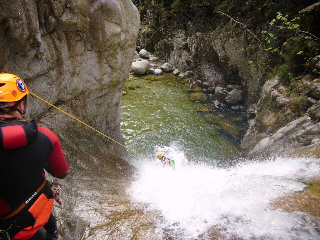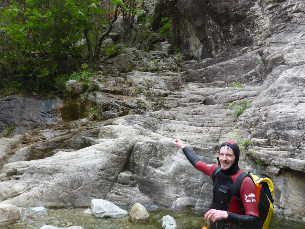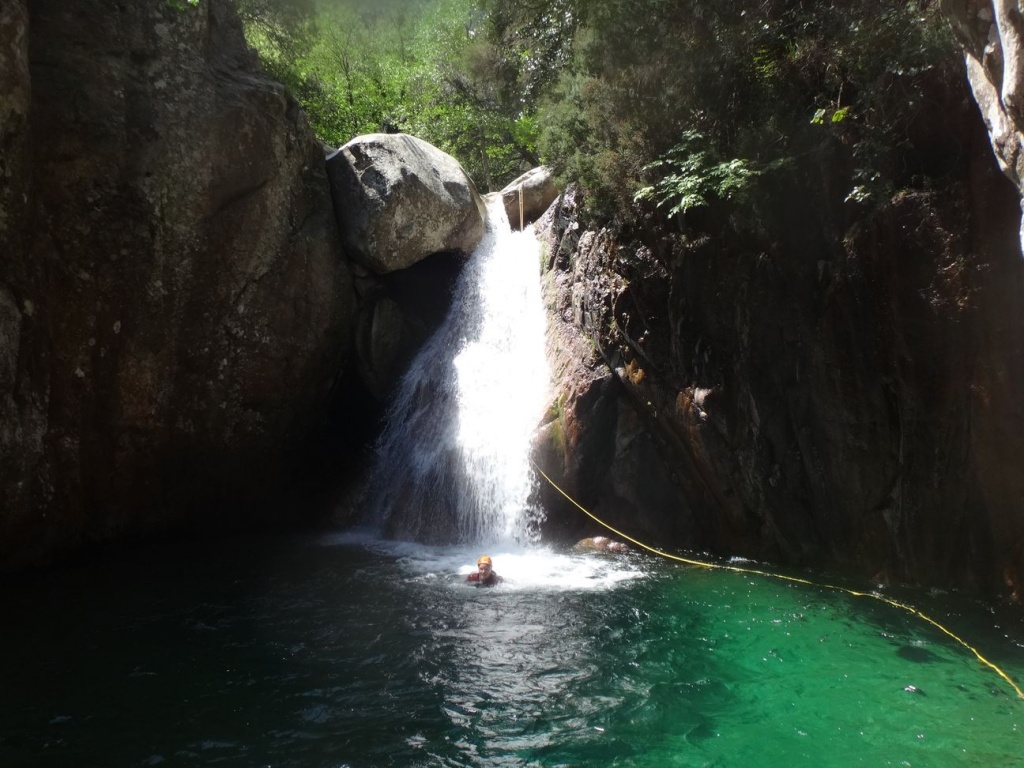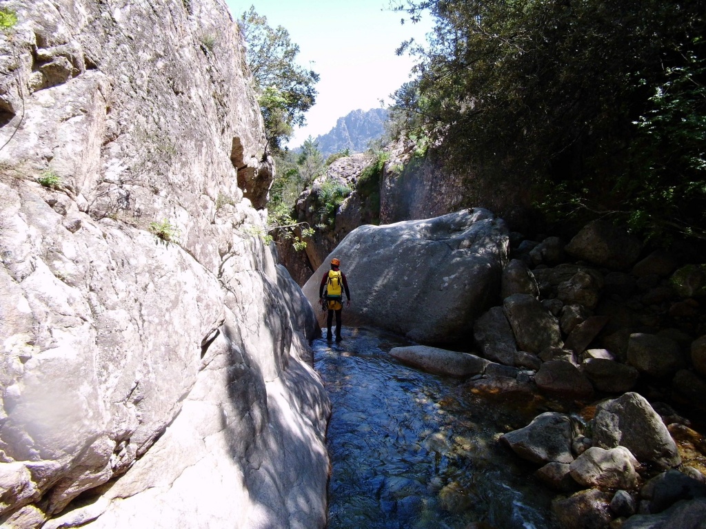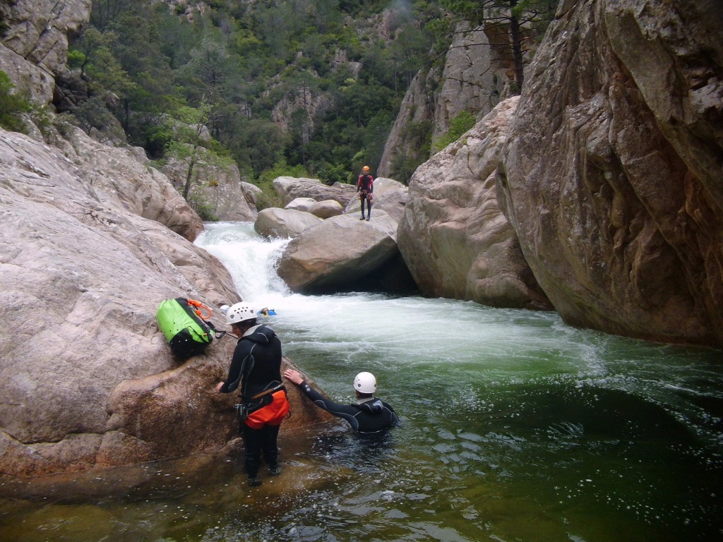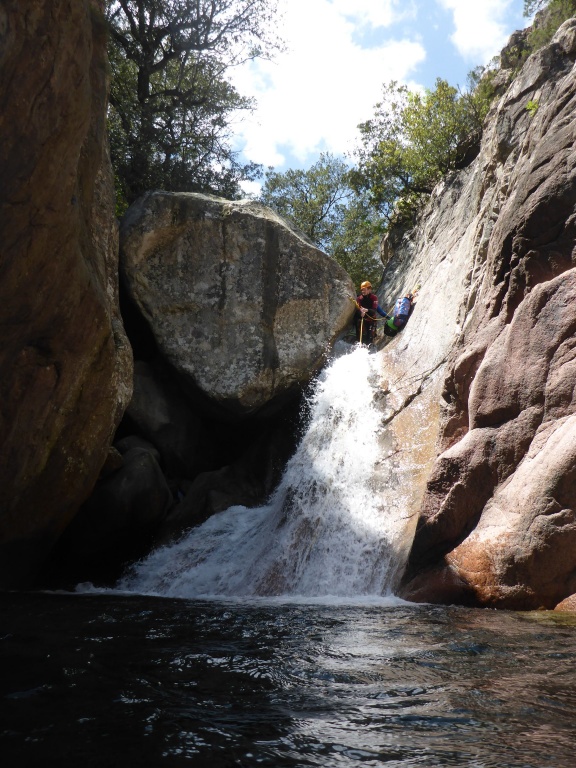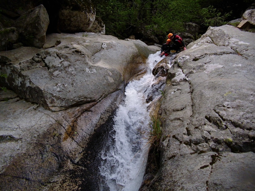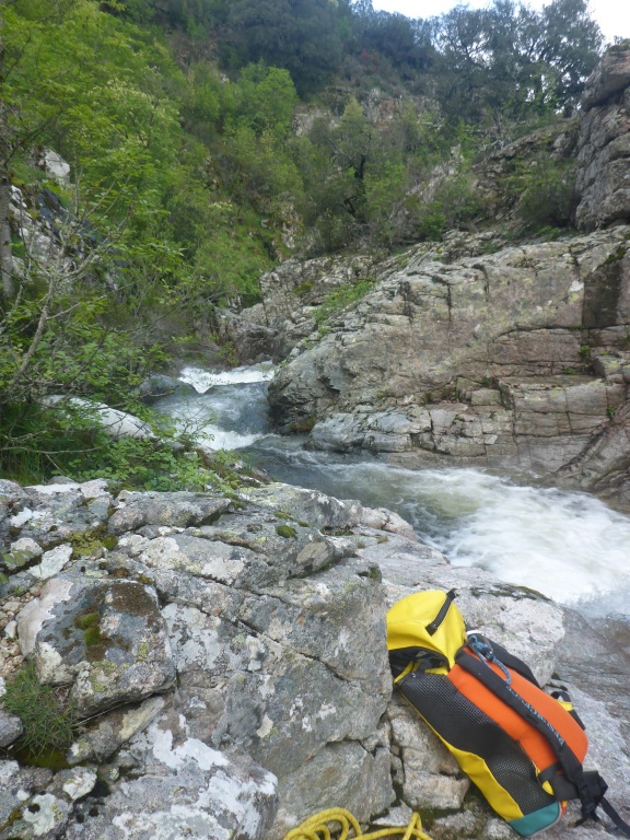 Als Alternativtour für diejenigen die in der Vacca noch nicht müde wurden sind wir in einem Fluß gegangen, an dem wir die Tage zuvor immer wieder Leute gesehen hatten, welcher uns aber nicht bekannt war. Um den Fluss zu erreichen fährt man von Solenzara in Richtung Bavella Pass und dann wo auf der rechten Seite der Ciuffatu rauskommt geht etwa 500m davor links der Gaglioli rein (siehe auch 1:25000 Karte). Zustieg zuerst dem Bachbett folgend bis man zu einer Gabelung kommt, dann dem linken Ast kurz folgen und dann einem schmalen Pfad den Hügel hinauf. Oben angekommen (nach etwa 15-20min) warten einige nette Canyoningstellen auf uns, ein gemütlicher Anfängercanyon.