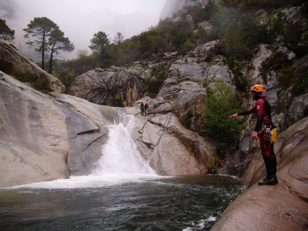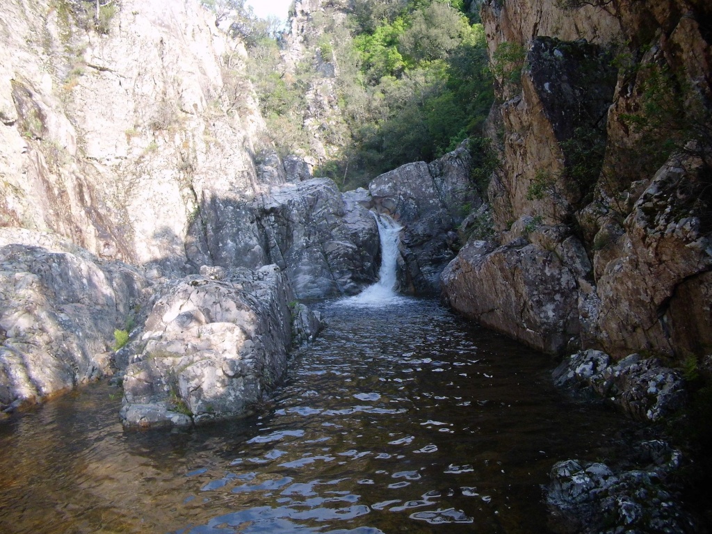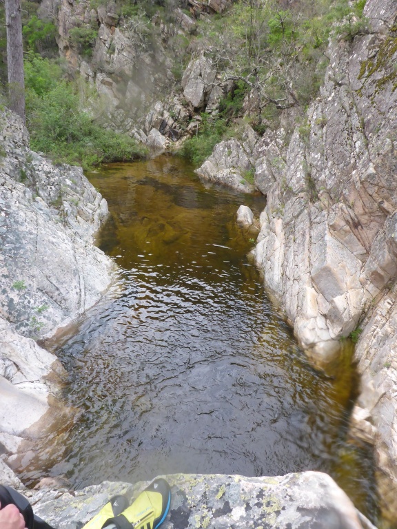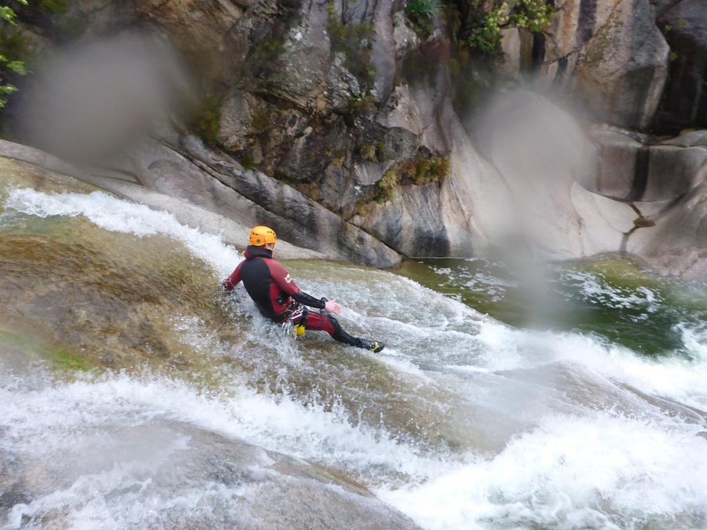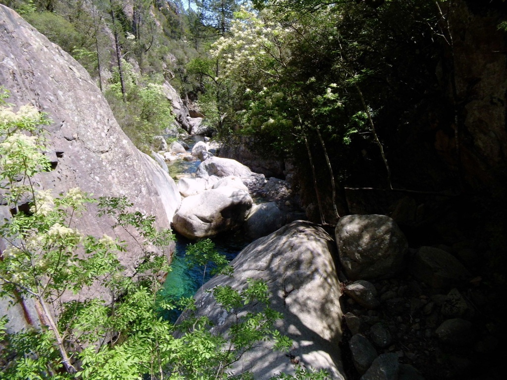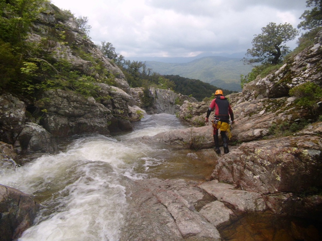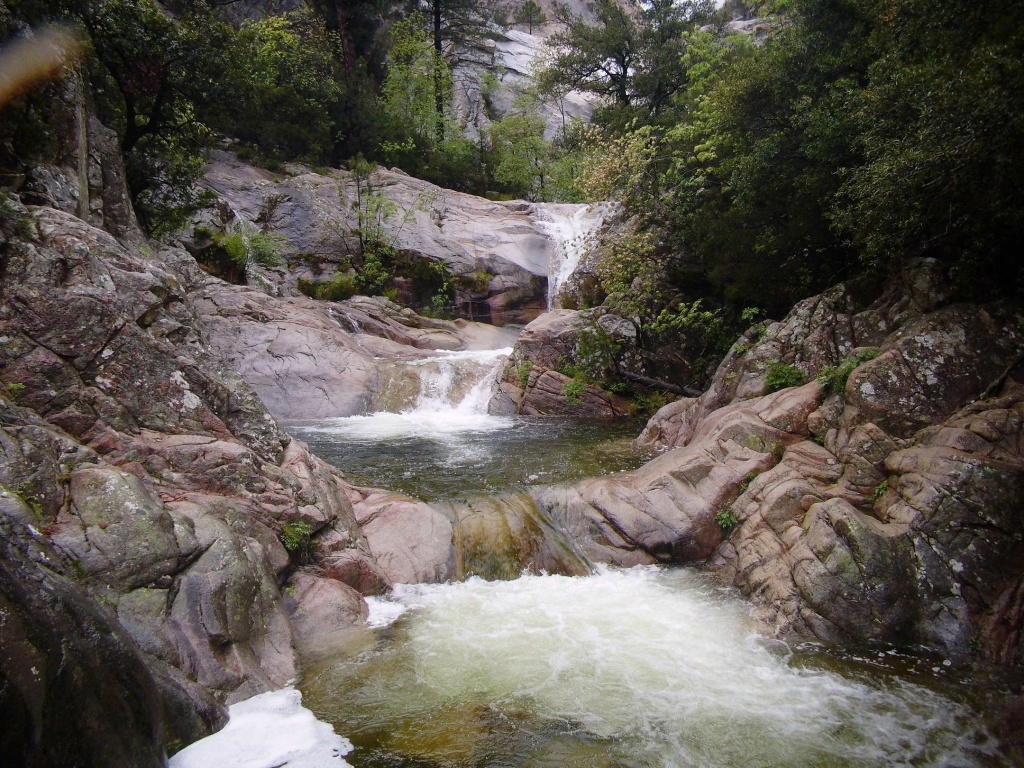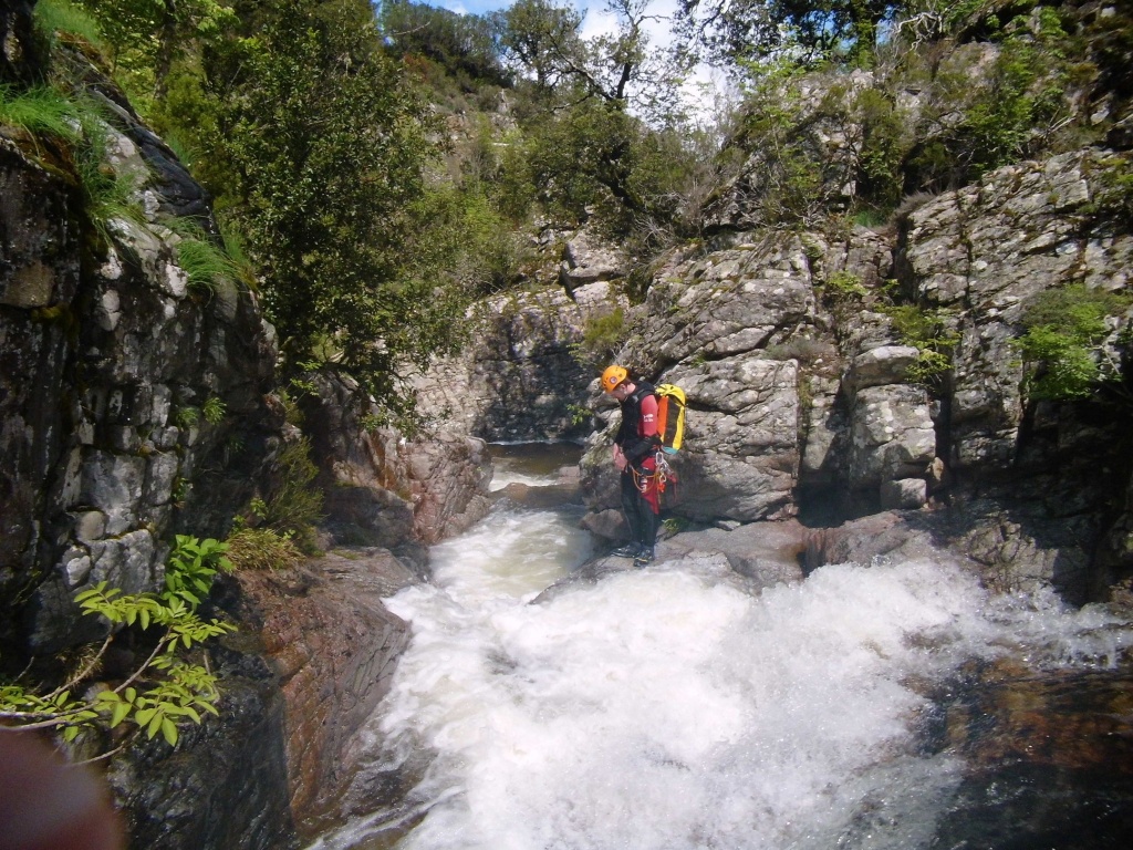 Als Alternativtour für diejenigen die in der Vacca noch nicht müde wurden sind wir in einem Fluß gegangen, an dem wir die Tage zuvor immer wieder Leute gesehen hatten, welcher uns aber nicht bekannt war. Um den Fluss zu erreichen fährt man von Solenzara in Richtung Bavella Pass und dann wo auf der rechten Seite der Ciuffatu rauskommt geht etwa 500m davor links der Gaglioli rein (siehe auch 1:25000 Karte). Zustieg zuerst dem Bachbett folgend bis man zu einer Gabelung kommt, dann dem linken Ast kurz folgen und dann einem schmalen Pfad den Hügel hinauf. Oben angekommen (nach etwa 15-20min) warten einige nette Canyoningstellen auf uns, ein gemütlicher Anfängercanyon.