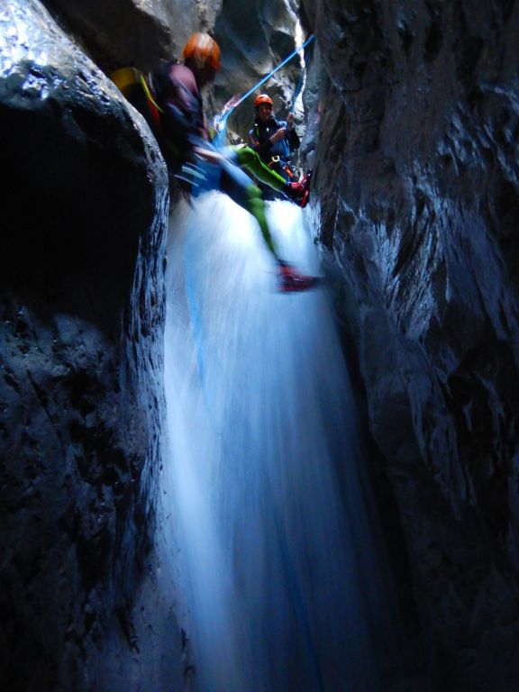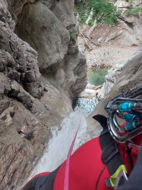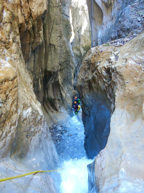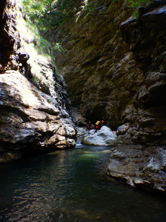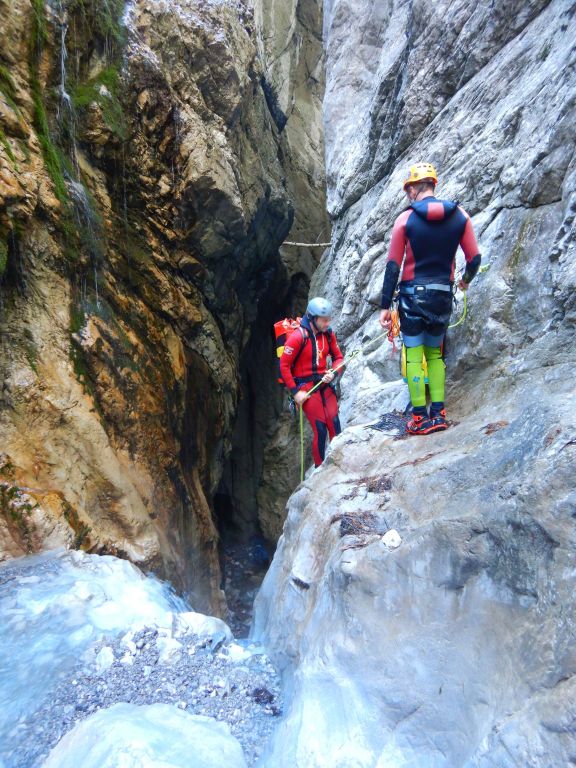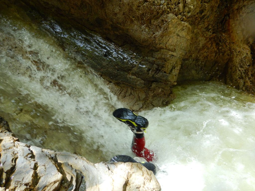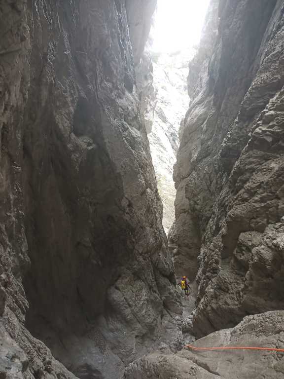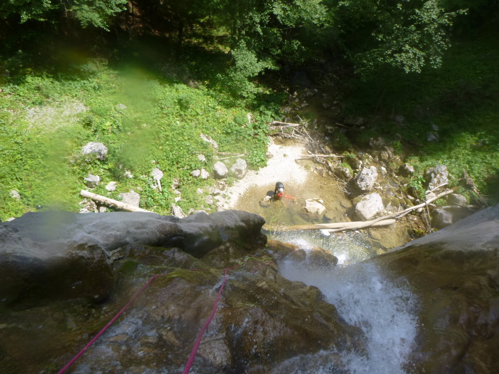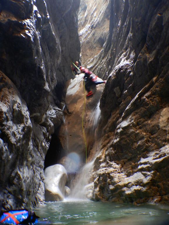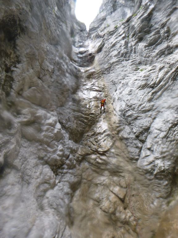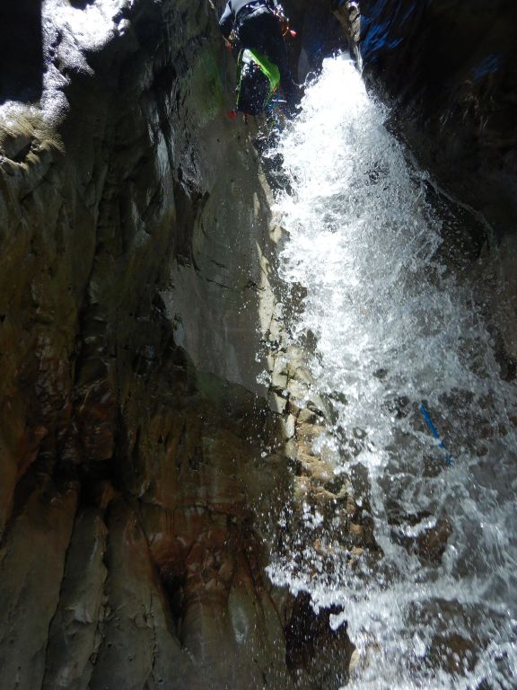 orthografisch rechts hoch, sehr steil einem kleinen Pfad folgend und erreicht schon bald einen kleinen ziemlich ebenen Weg dem man folgt bis man wieder zur Schlucht hinunter kann, dort ist dann quasi der Einstieg zum interessanten Teil der Tour. Auch hier hatten wir gut Wasser aber alles im grünen Bereich. Sprünge, Abseiler und kleine Rutschen wechseln sich ab, Gehstrecken such man vergebens.