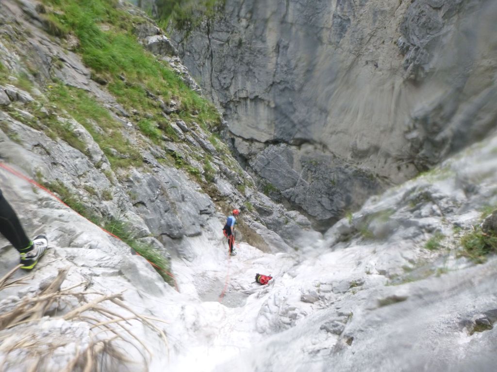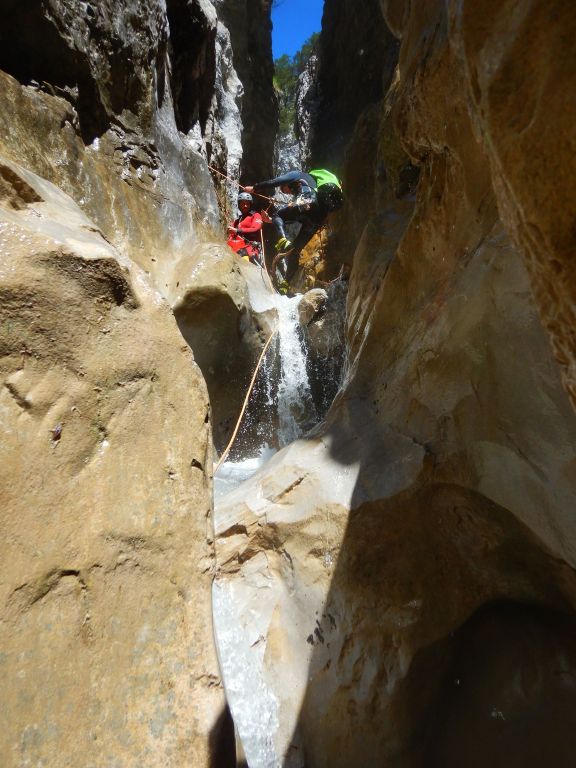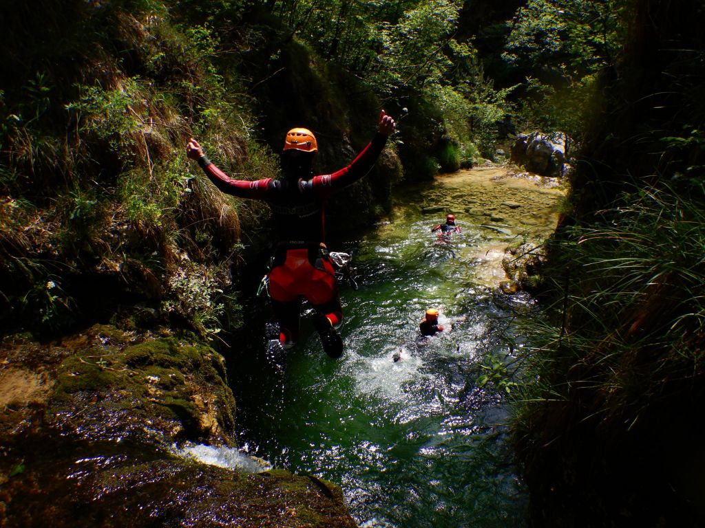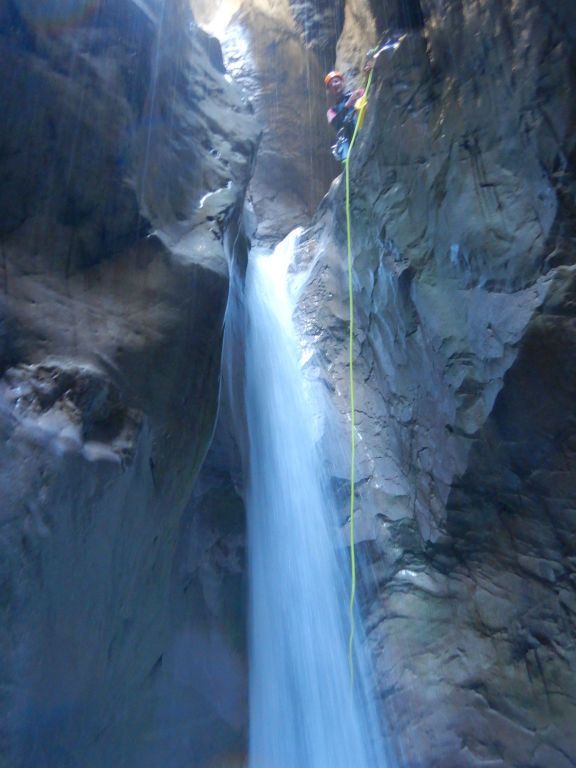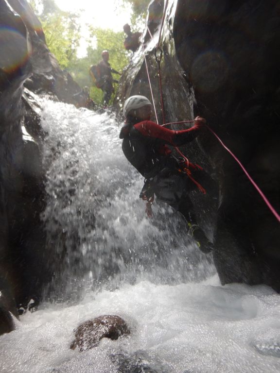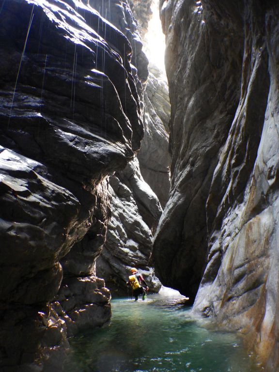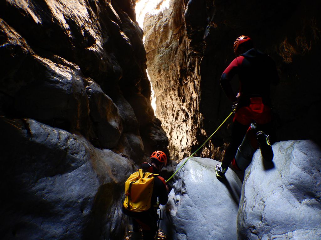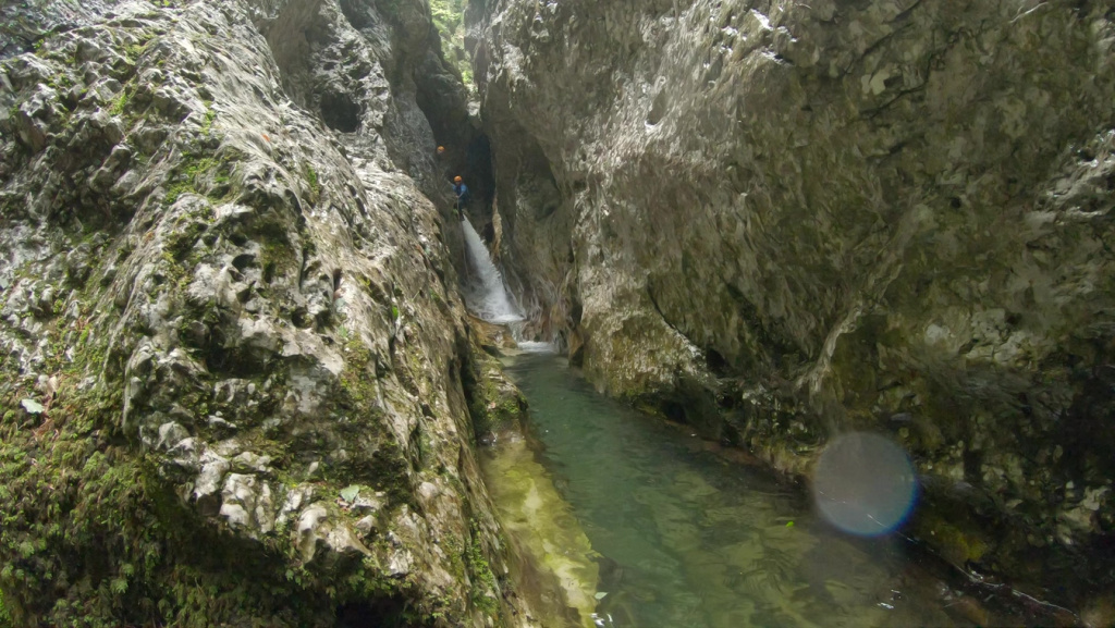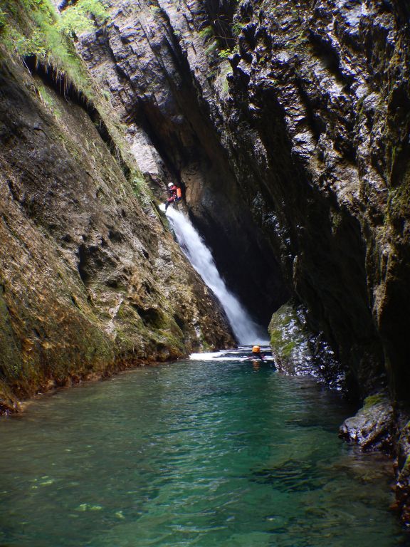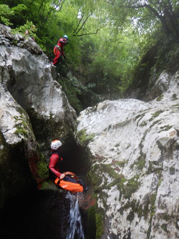orthografisch rechts hoch, sehr steil einem kleinen Pfad folgend und erreicht schon bald einen kleinen ziemlich ebenen Weg dem man folgt bis man wieder zur Schlucht hinunter kann, dort ist dann quasi der Einstieg zum interessanten Teil der Tour. Auch hier hatten wir gut Wasser aber alles im grünen Bereich. Sprünge, Abseiler und kleine Rutschen wechseln sich ab, Gehstrecken such man vergebens.