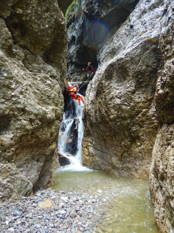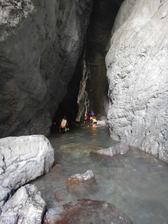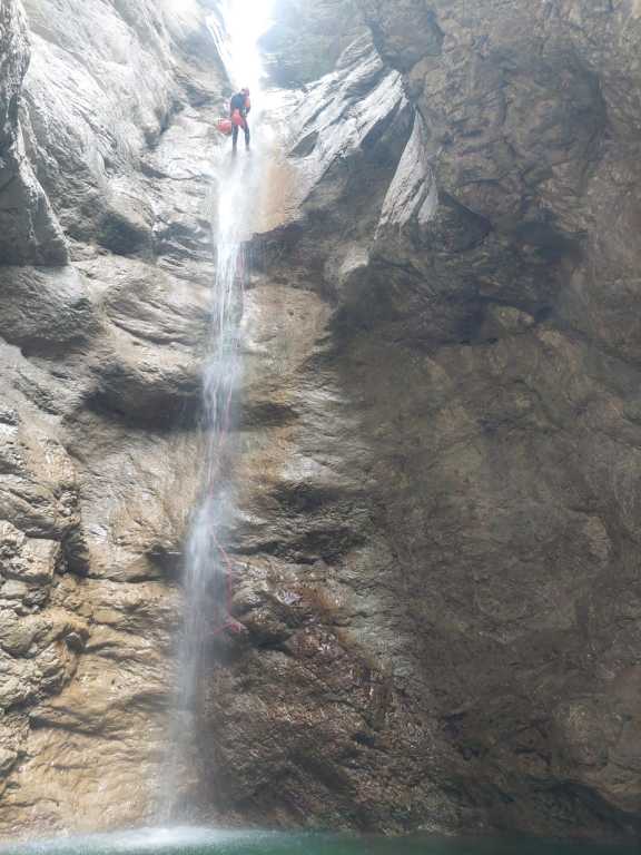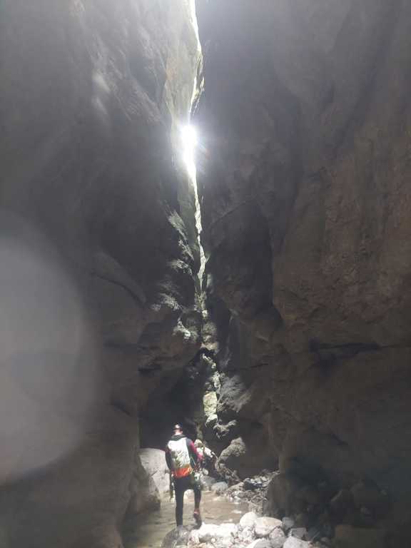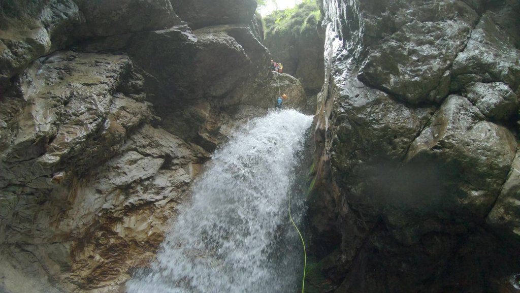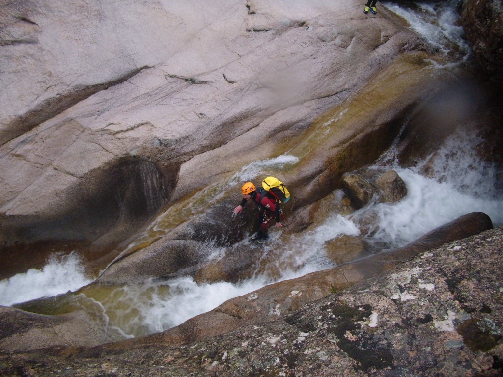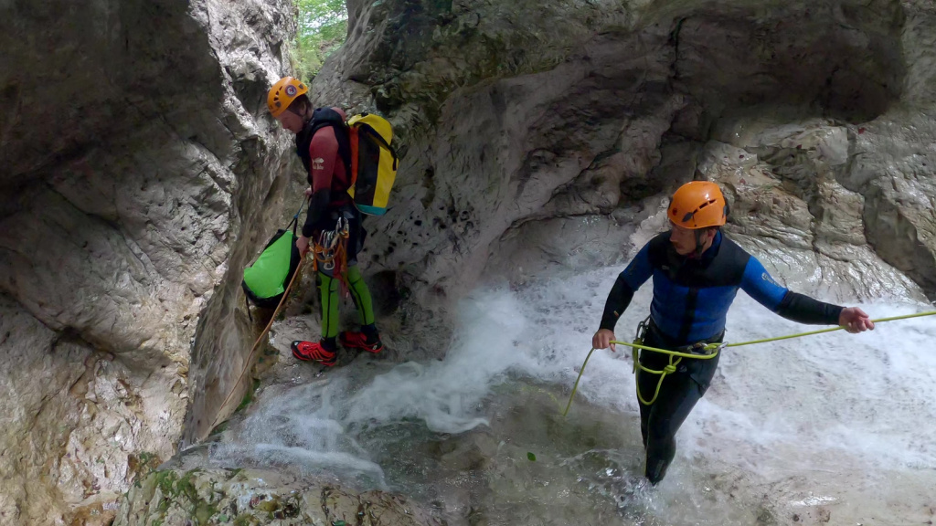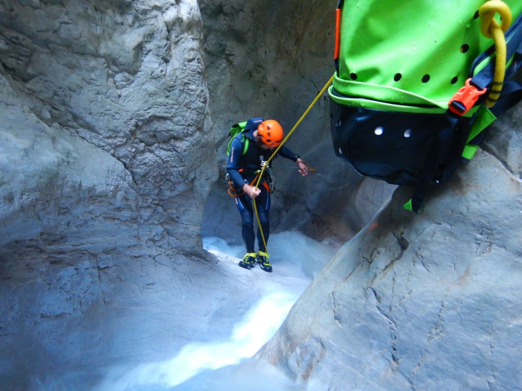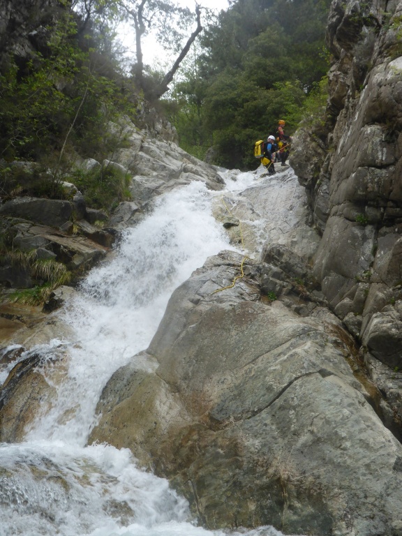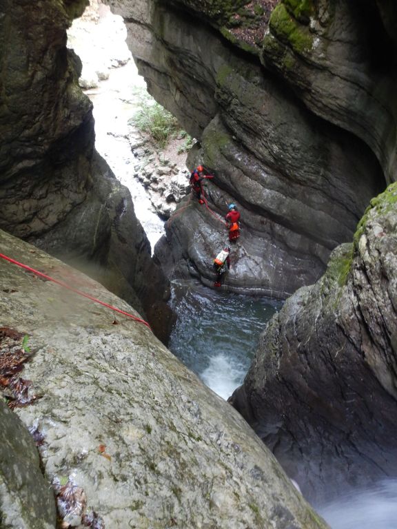 orthografisch rechts hoch, sehr steil einem kleinen Pfad folgend und erreicht schon bald einen kleinen ziemlich ebenen Weg dem man folgt bis man wieder zur Schlucht hinunter kann, dort ist dann quasi der Einstieg zum interessanten Teil der Tour. Auch hier hatten wir gut Wasser aber alles im grünen Bereich. Sprünge, Abseiler und kleine Rutschen wechseln sich ab, Gehstrecken such man vergebens.