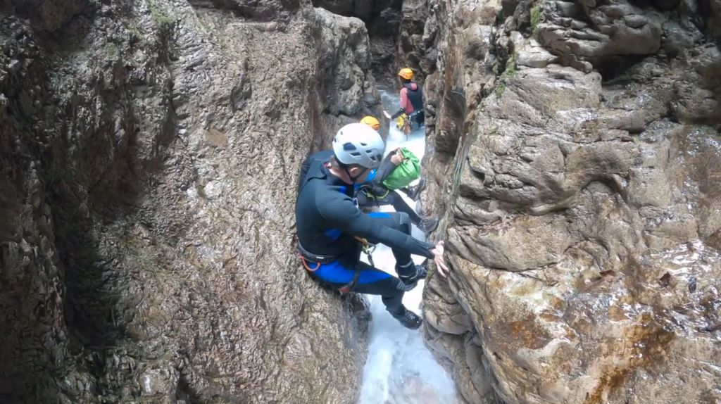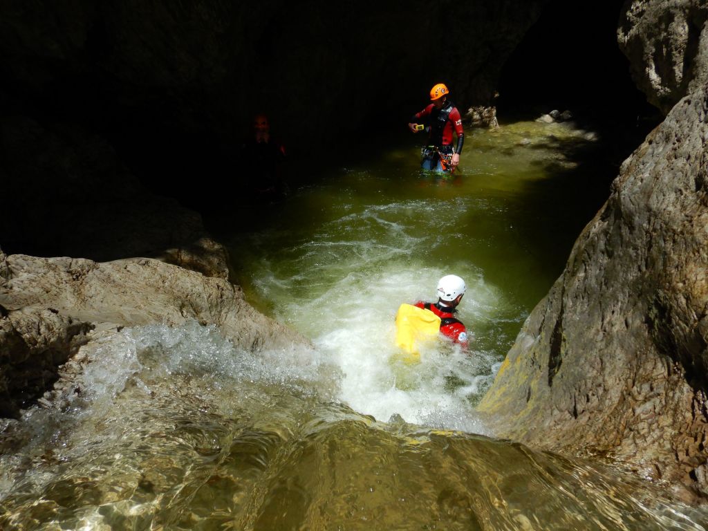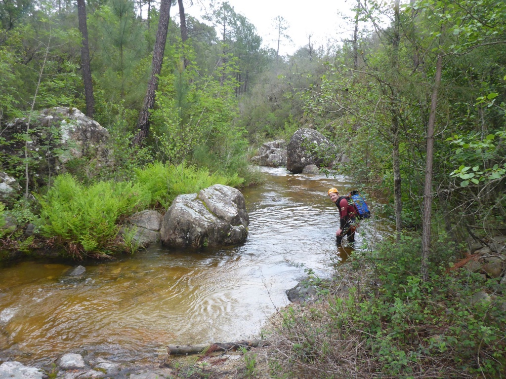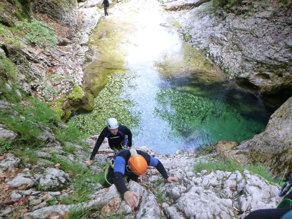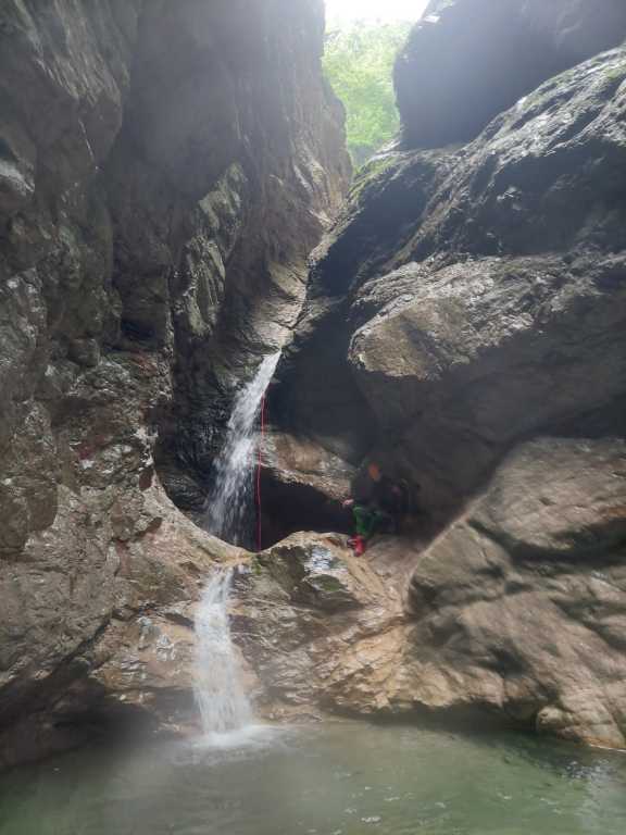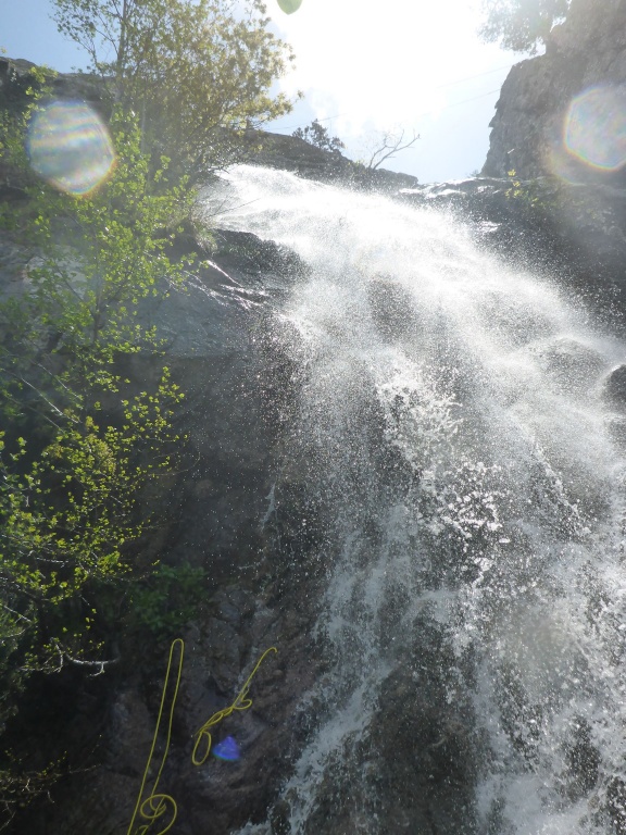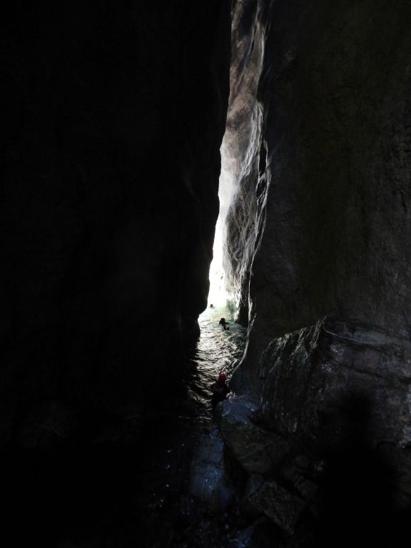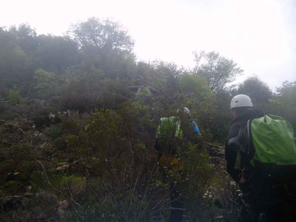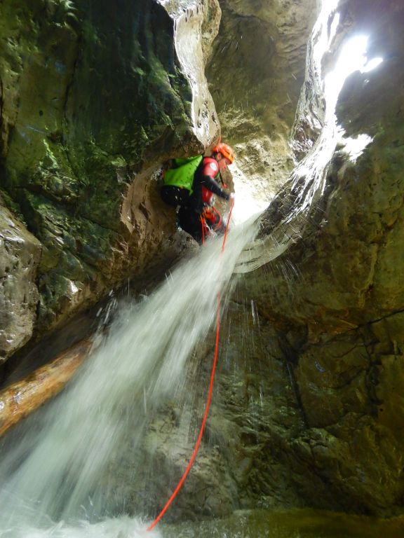orthografisch rechts hoch, sehr steil einem kleinen Pfad folgend und erreicht schon bald einen kleinen ziemlich ebenen Weg dem man folgt bis man wieder zur Schlucht hinunter kann, dort ist dann quasi der Einstieg zum interessanten Teil der Tour. Auch hier hatten wir gut Wasser aber alles im grünen Bereich. Sprünge, Abseiler und kleine Rutschen wechseln sich ab, Gehstrecken such man vergebens.