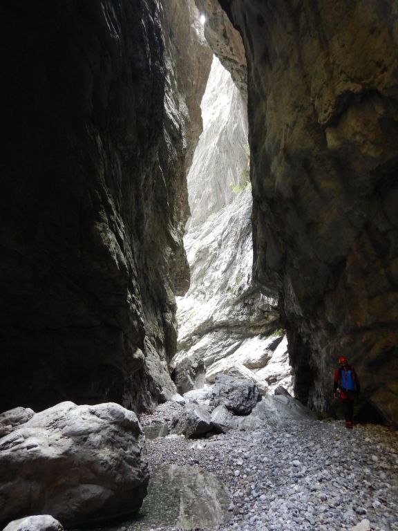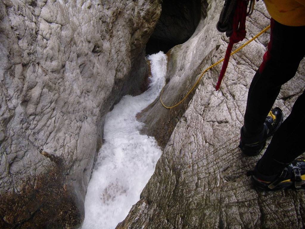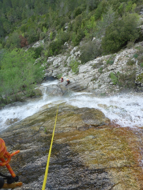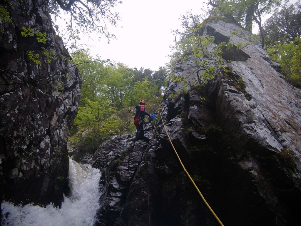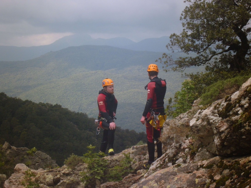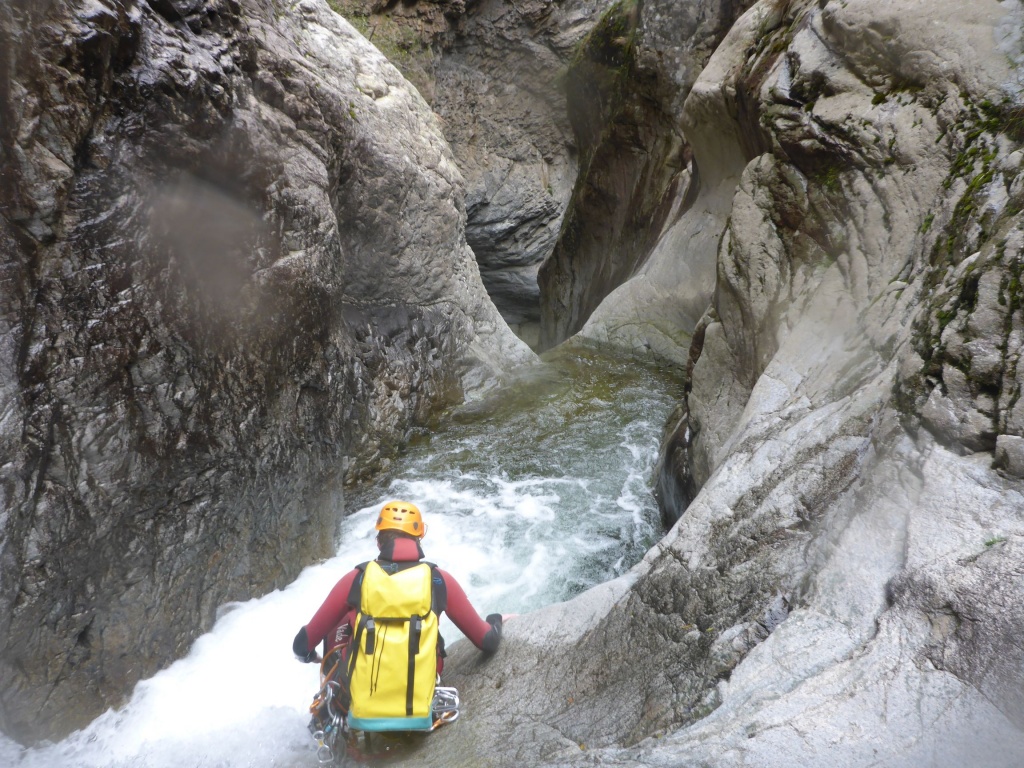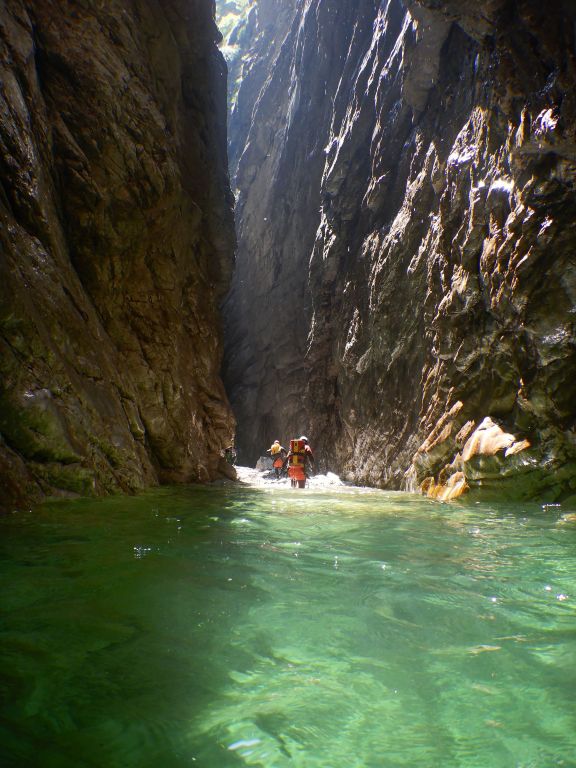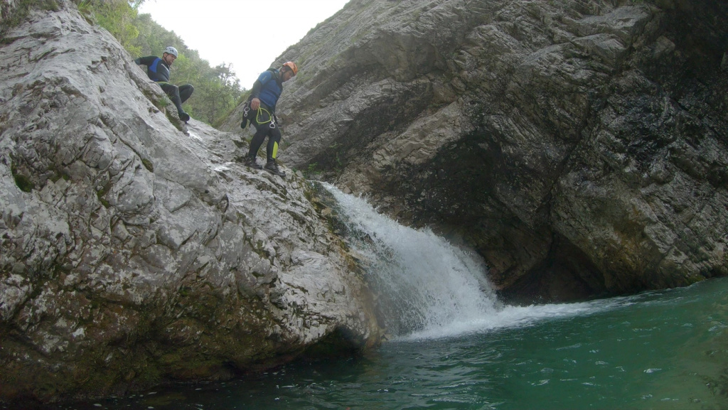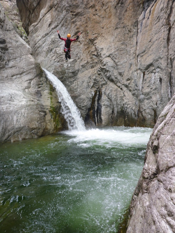 orthografisch rechts hoch, sehr steil einem kleinen Pfad folgend und erreicht schon bald einen kleinen ziemlich ebenen Weg dem man folgt bis man wieder zur Schlucht hinunter kann, dort ist dann quasi der Einstieg zum interessanten Teil der Tour. Auch hier hatten wir gut Wasser aber alles im grünen Bereich. Sprünge, Abseiler und kleine Rutschen wechseln sich ab, Gehstrecken such man vergebens.