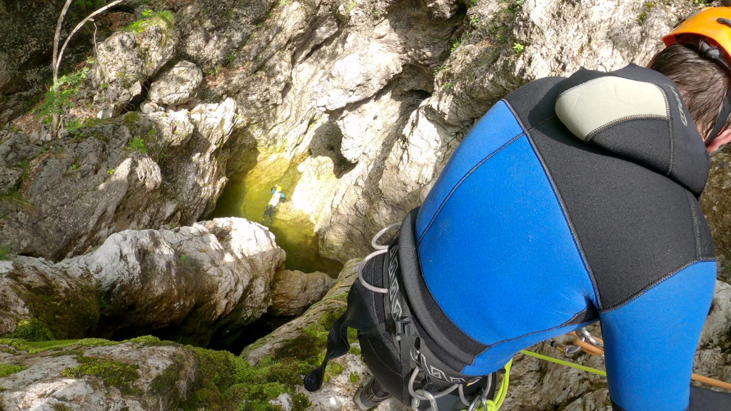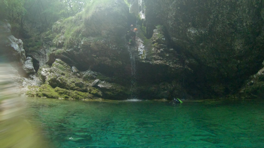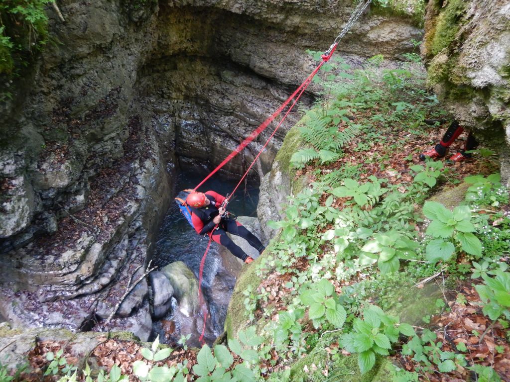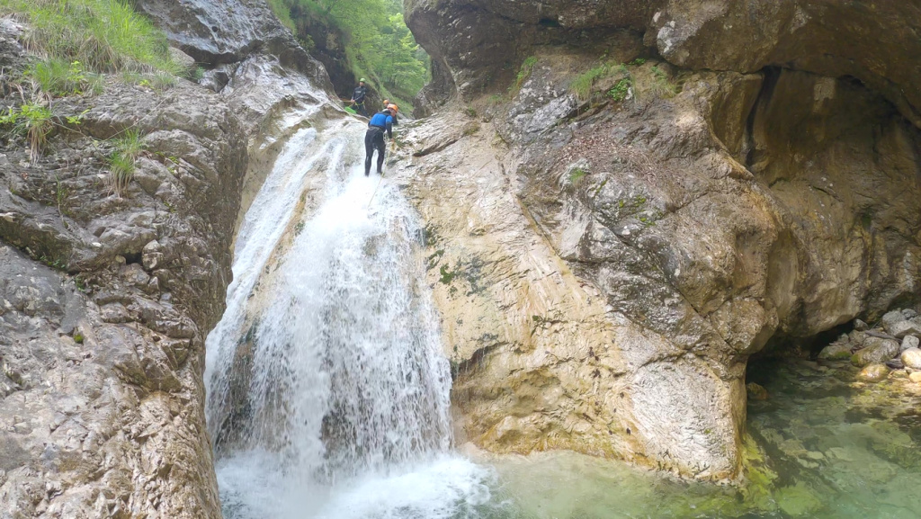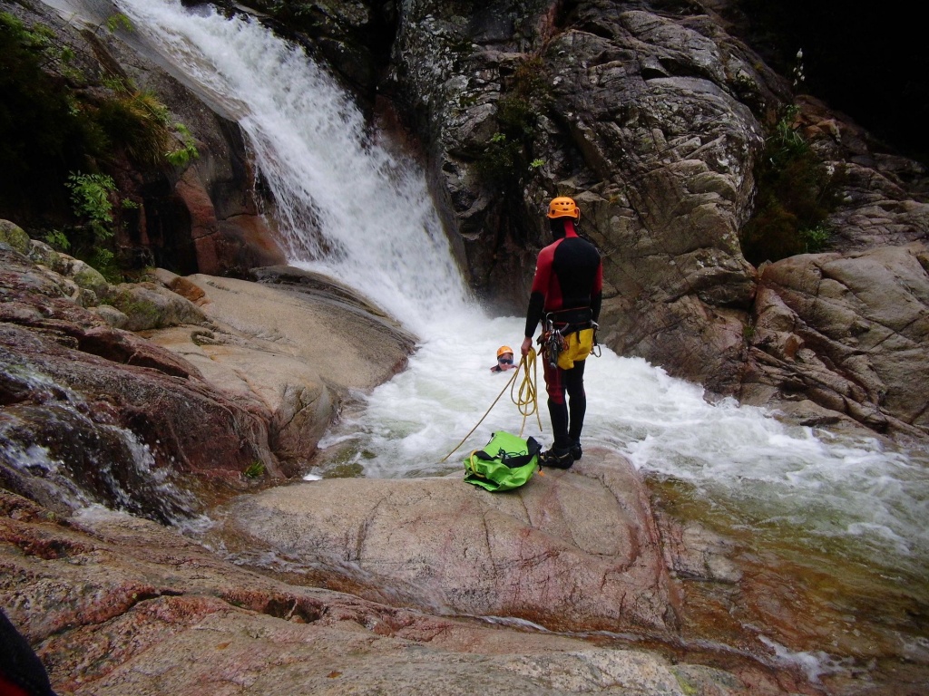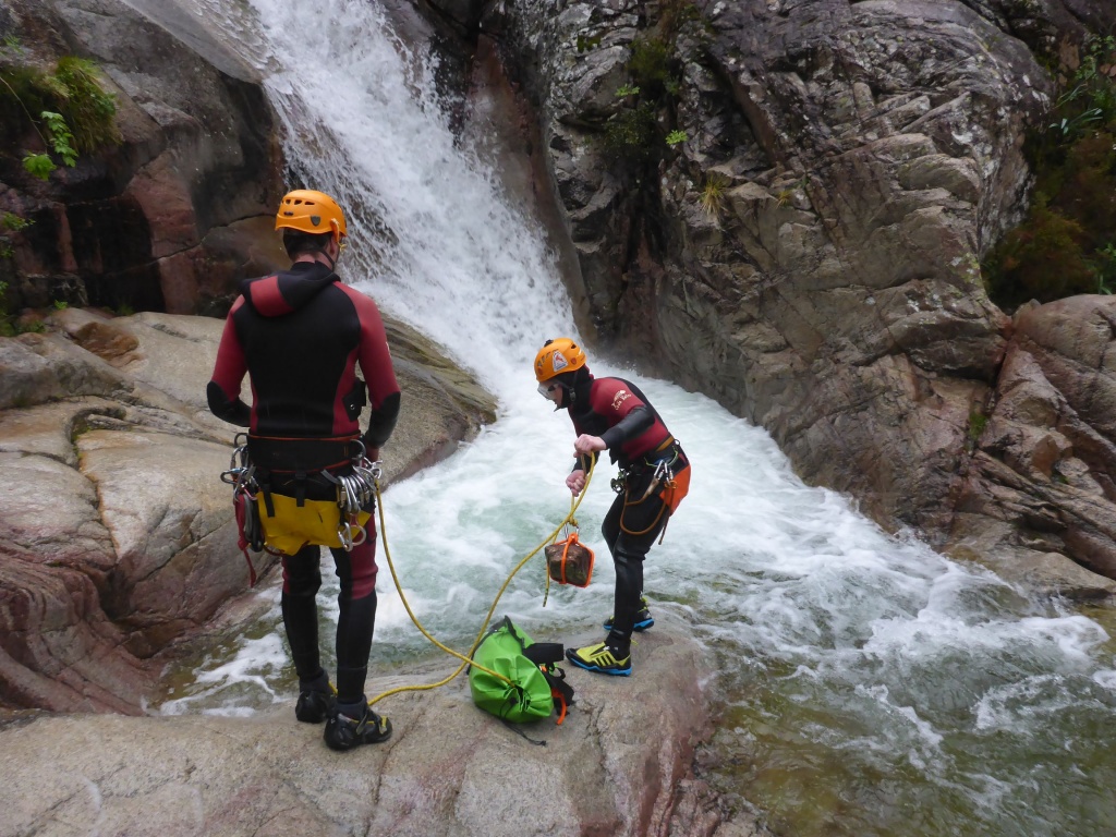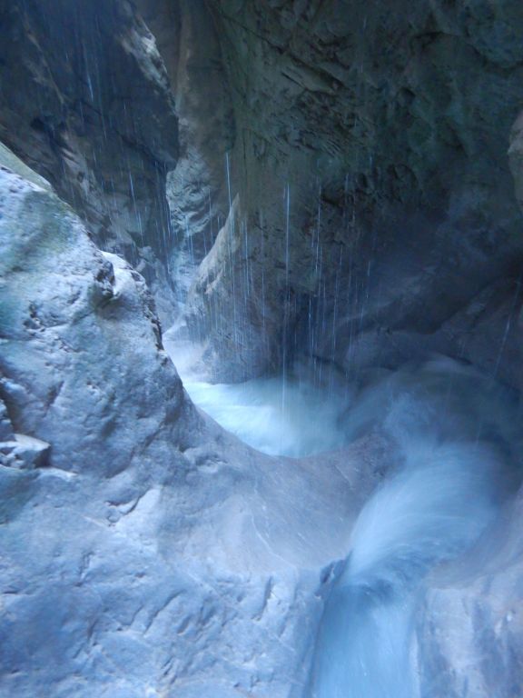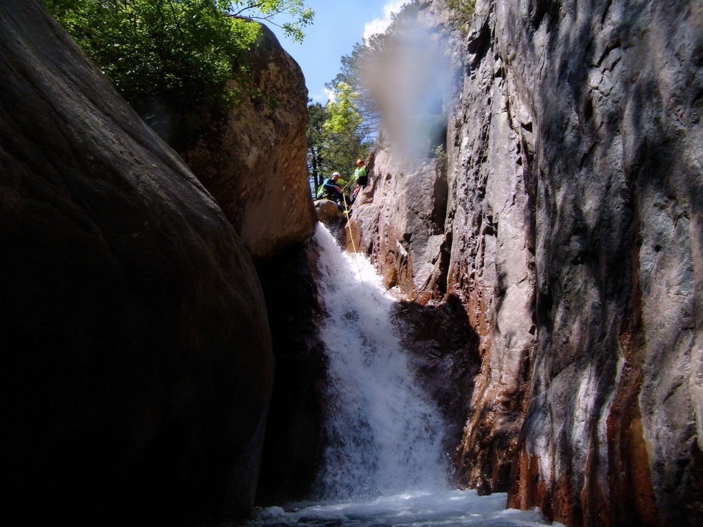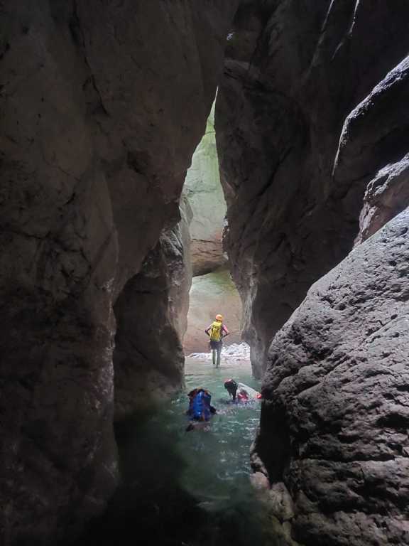 orthografisch rechts hoch, sehr steil einem kleinen Pfad folgend und erreicht schon bald einen kleinen ziemlich ebenen Weg dem man folgt bis man wieder zur Schlucht hinunter kann, dort ist dann quasi der Einstieg zum interessanten Teil der Tour. Auch hier hatten wir gut Wasser aber alles im grünen Bereich. Sprünge, Abseiler und kleine Rutschen wechseln sich ab, Gehstrecken such man vergebens.