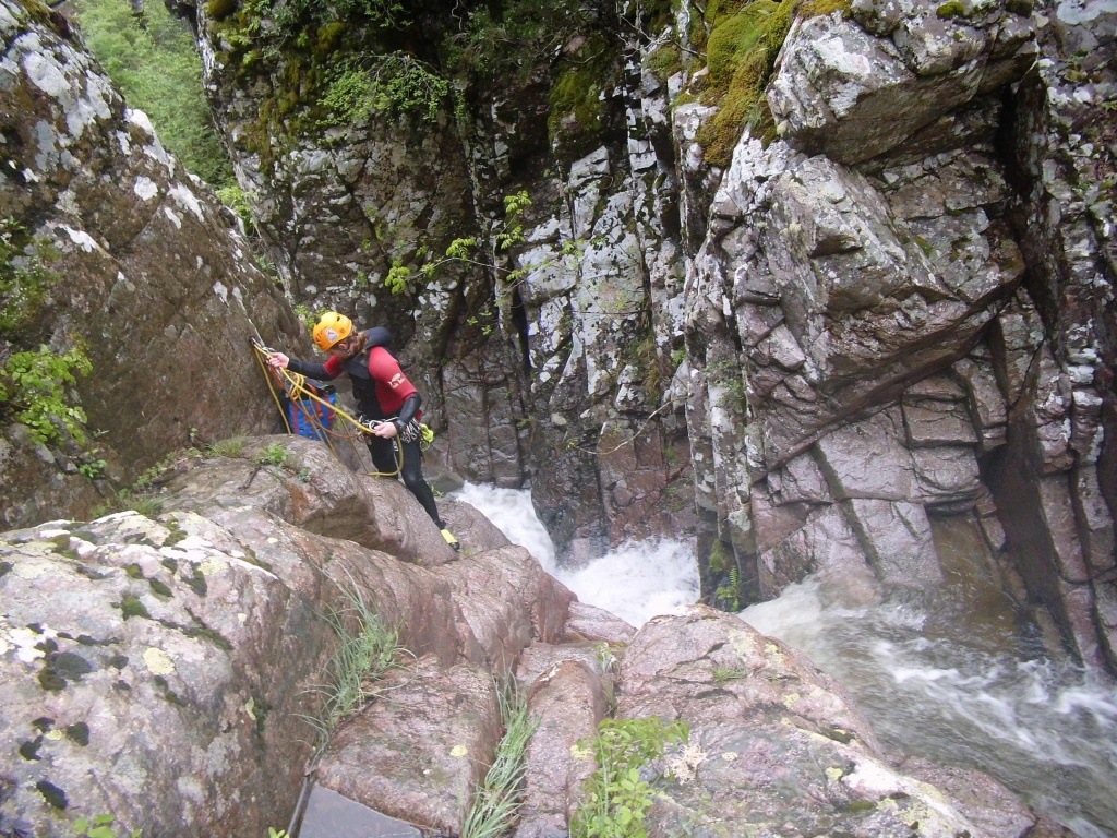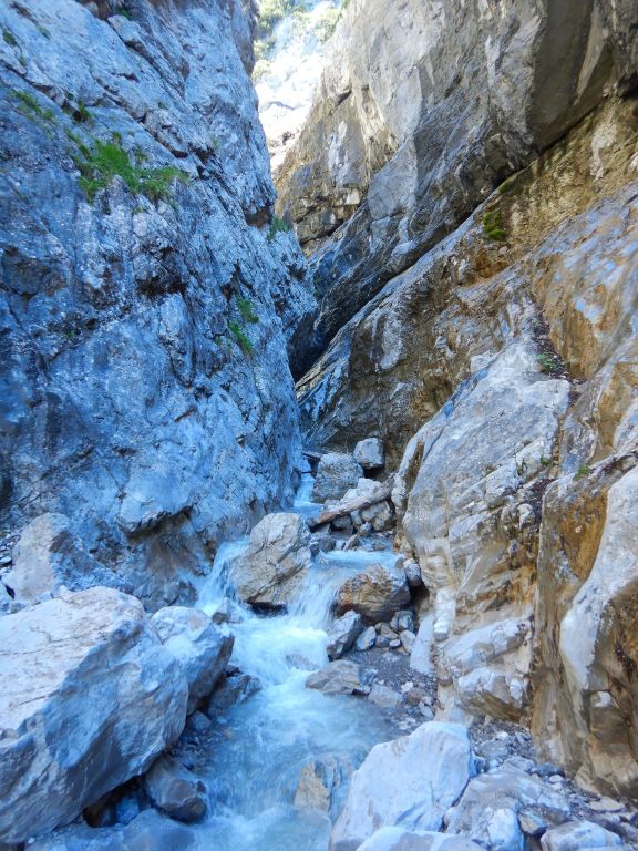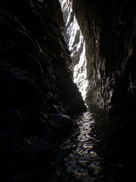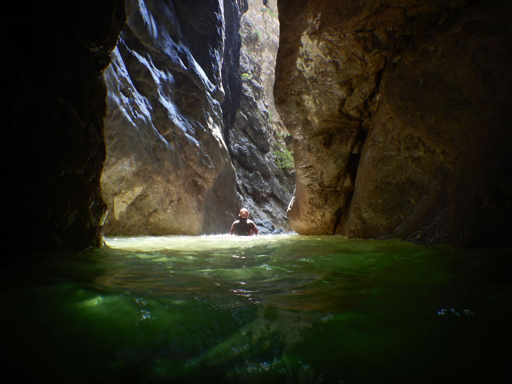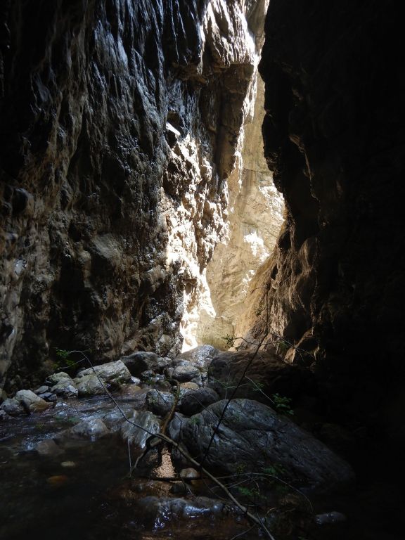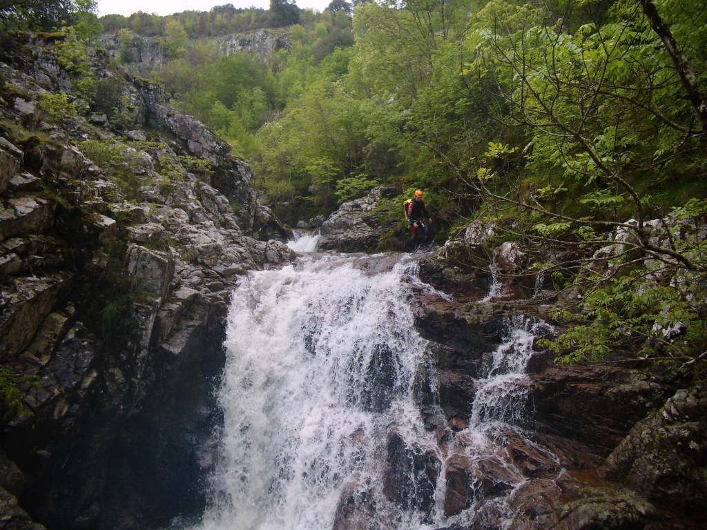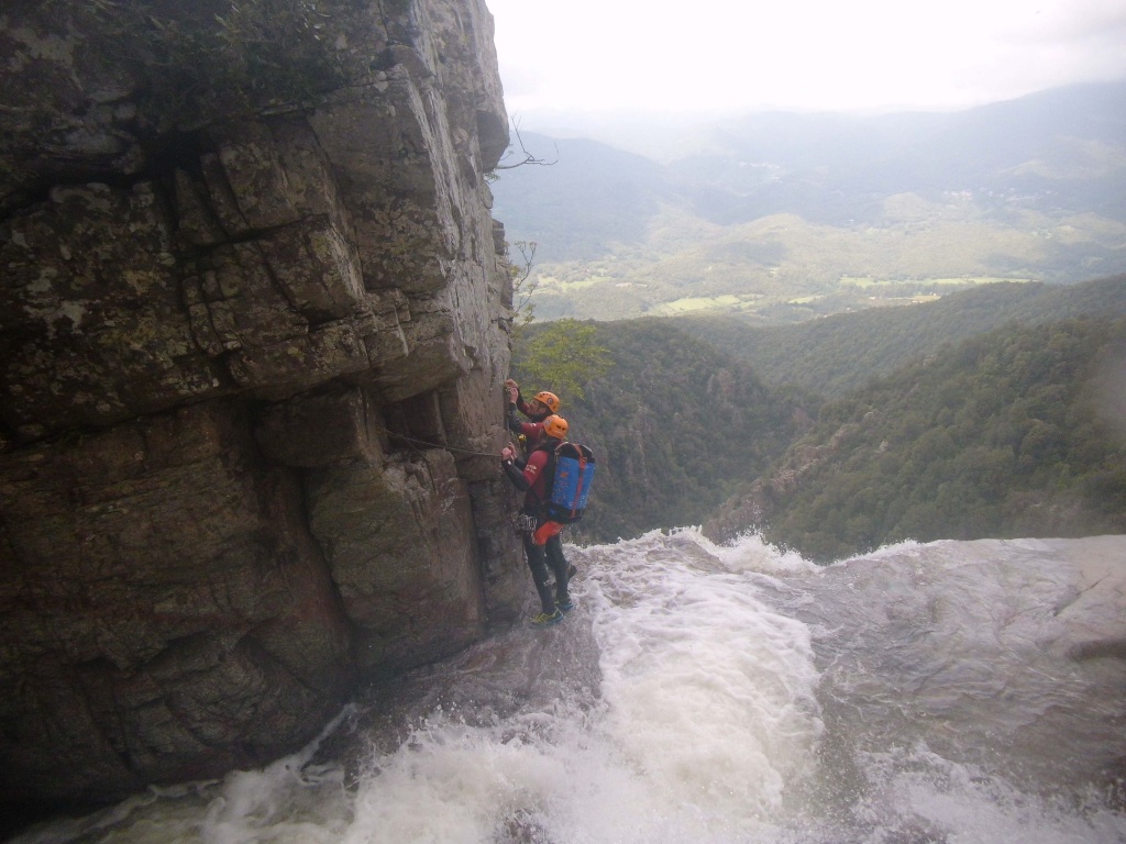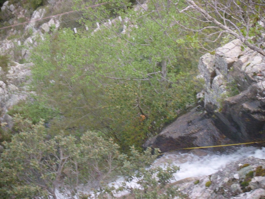 orthografisch rechts hoch, sehr steil einem kleinen Pfad folgend und erreicht schon bald einen kleinen ziemlich ebenen Weg dem man folgt bis man wieder zur Schlucht hinunter kann, dort ist dann quasi der Einstieg zum interessanten Teil der Tour. Auch hier hatten wir gut Wasser aber alles im grünen Bereich. Sprünge, Abseiler und kleine Rutschen wechseln sich ab, Gehstrecken such man vergebens.