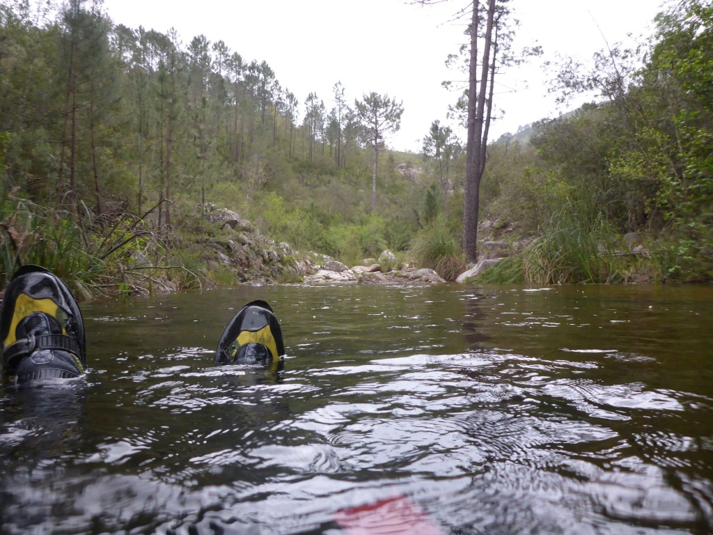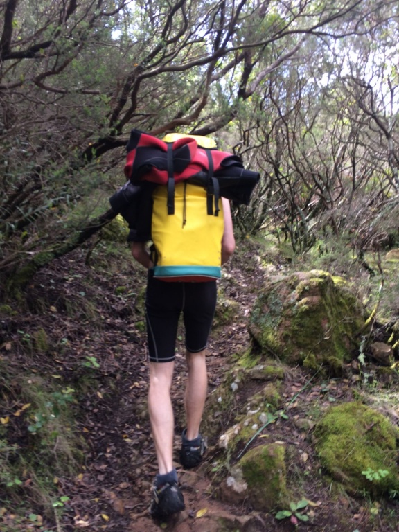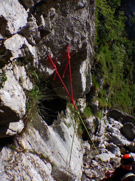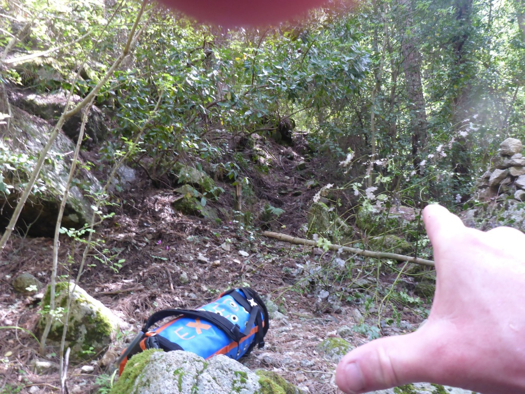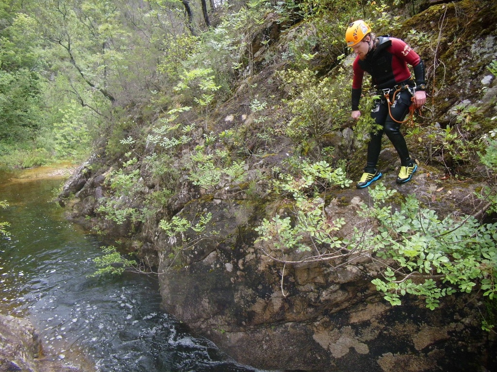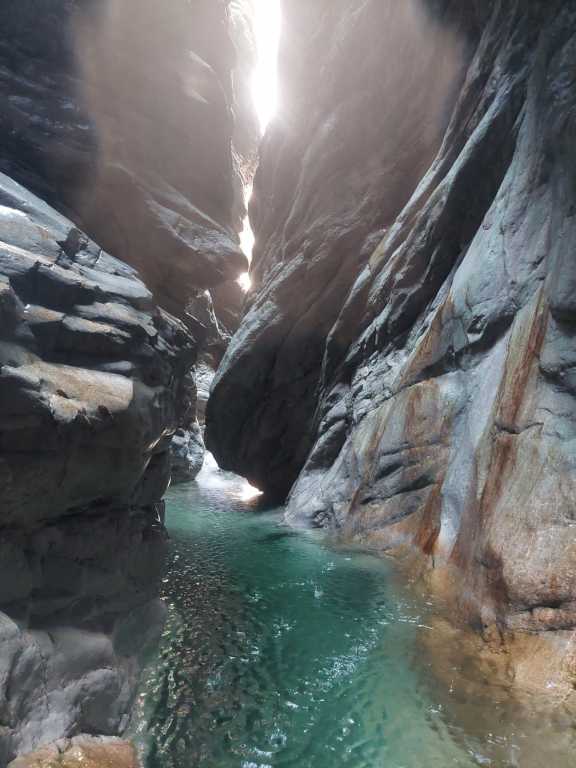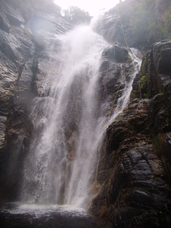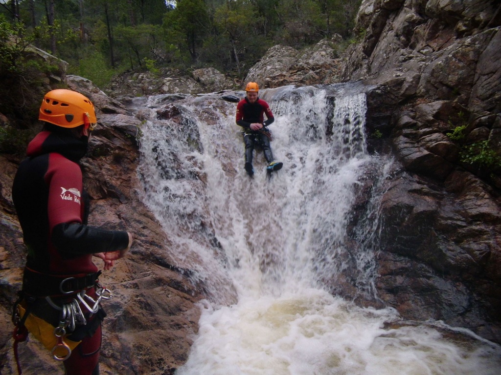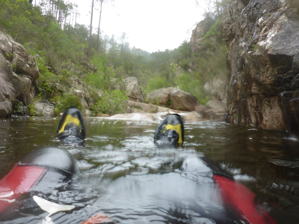 orthografisch rechts hoch, sehr steil einem kleinen Pfad folgend und erreicht schon bald einen kleinen ziemlich ebenen Weg dem man folgt bis man wieder zur Schlucht hinunter kann, dort ist dann quasi der Einstieg zum interessanten Teil der Tour. Auch hier hatten wir gut Wasser aber alles im grünen Bereich. Sprünge, Abseiler und kleine Rutschen wechseln sich ab, Gehstrecken such man vergebens.
