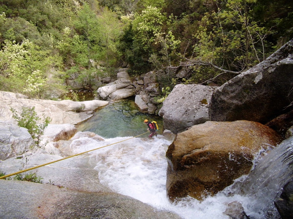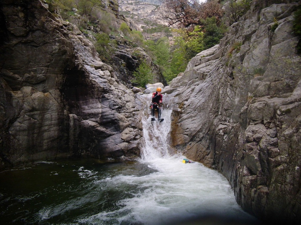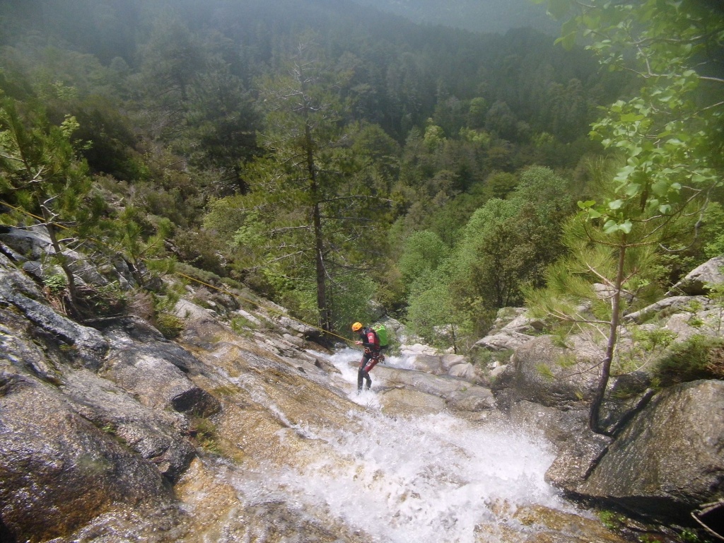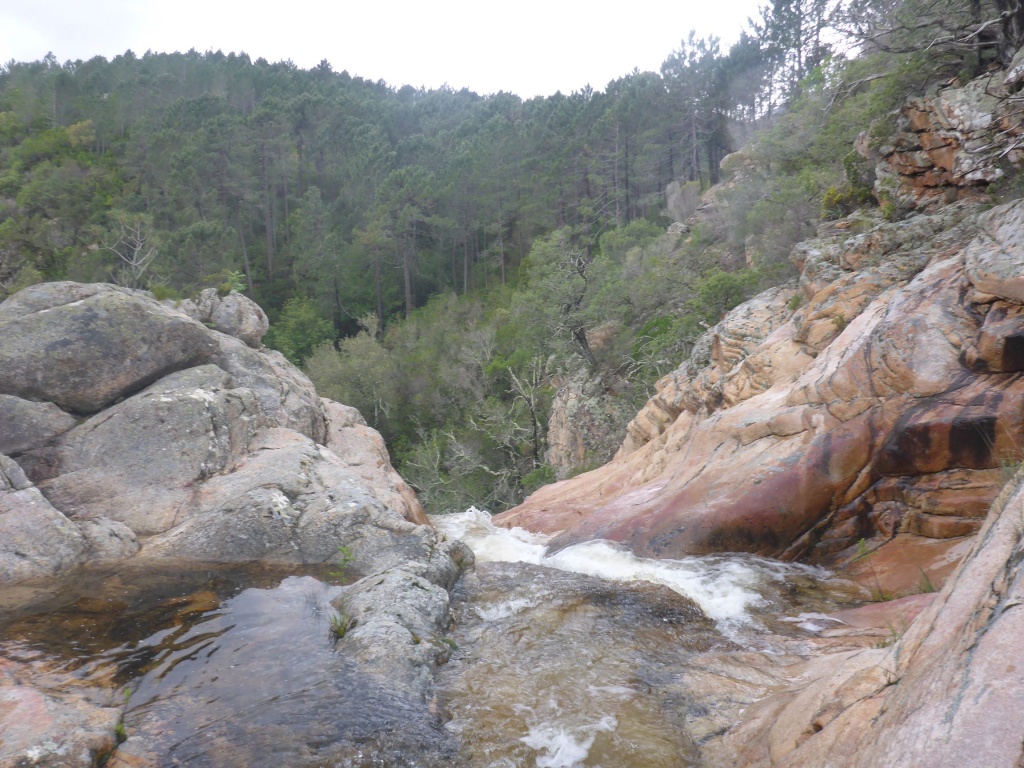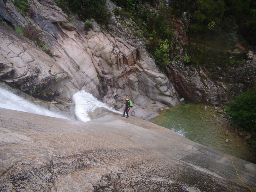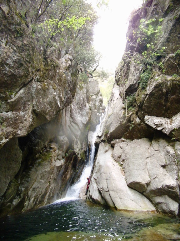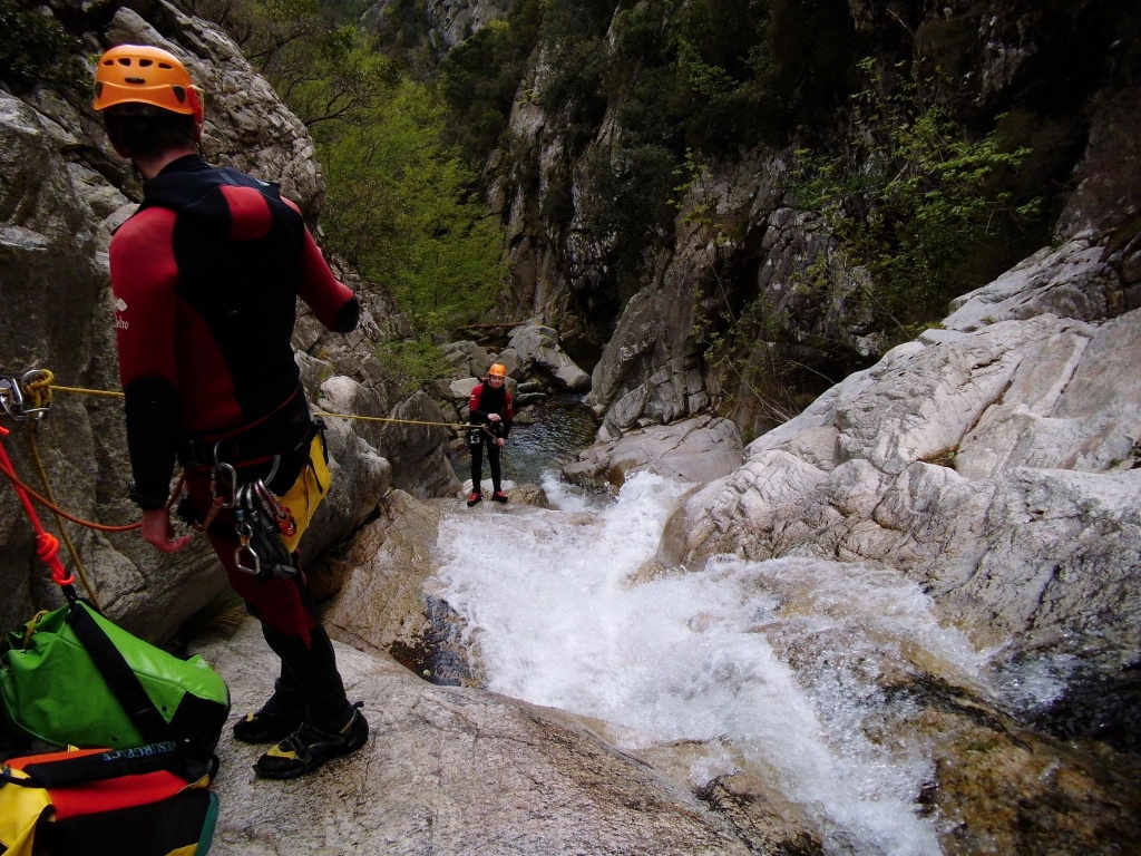 Dieser Bach hat sich in Angesicht der Wetterlage (Frühling + Regen = Viel Wasser) als richtige Auswahl herausgestellt. Im Sommer wahrscheinlich eine fast trockene Abseilpiste haben wir hier (meist) herrliches Canyoning genossen. Man fährt über den Bavella Pass und dann auf der anderen Seite bei einer Aussichtsplattform ist der Einstieg. Beim ersten Abseiler (Abseilstand nicht gefunden, Baum benützt) hätte sich ein 60m Seil ausgezahlt. Ich bin nach 50m in einem Baum/Gestrüpp/Stacheln gehängt um den zweiten Stand zu machen, 5m darunter war ein schönes Plato. Danach geht es Schlag auf Schlag eine tolle Abseilpiste, meist zwei Bohrhaken mit einem Schlingerl verbunden, manche davon haben wir getauscht. Später dann wird es etwas moosiger bis man dann auch schon den Riesensteinmann findet und der Ausstieg naht. Vom Steinmann quert man dann den kleineren Steinmännern folgend in einen zweiten Bach. Dort wussten wir dann nicht mehr weiter und wir sind dem Bach gefolgt und später dann mühselig durch die Stacheln einen steilen Hang hinaufgeklettert bevor wir durch den Wald nach einer gefühlten Ewigkeit den Feldweg erreichten. Richtigerweise hätten wir im 2. Bach sofort den Feldweg laut Karte anpeilen sollen, der dort wahrscheinlich bereits nach 5min Busch erreichbar gewesen wäre.
