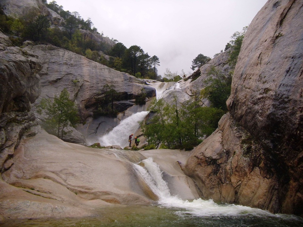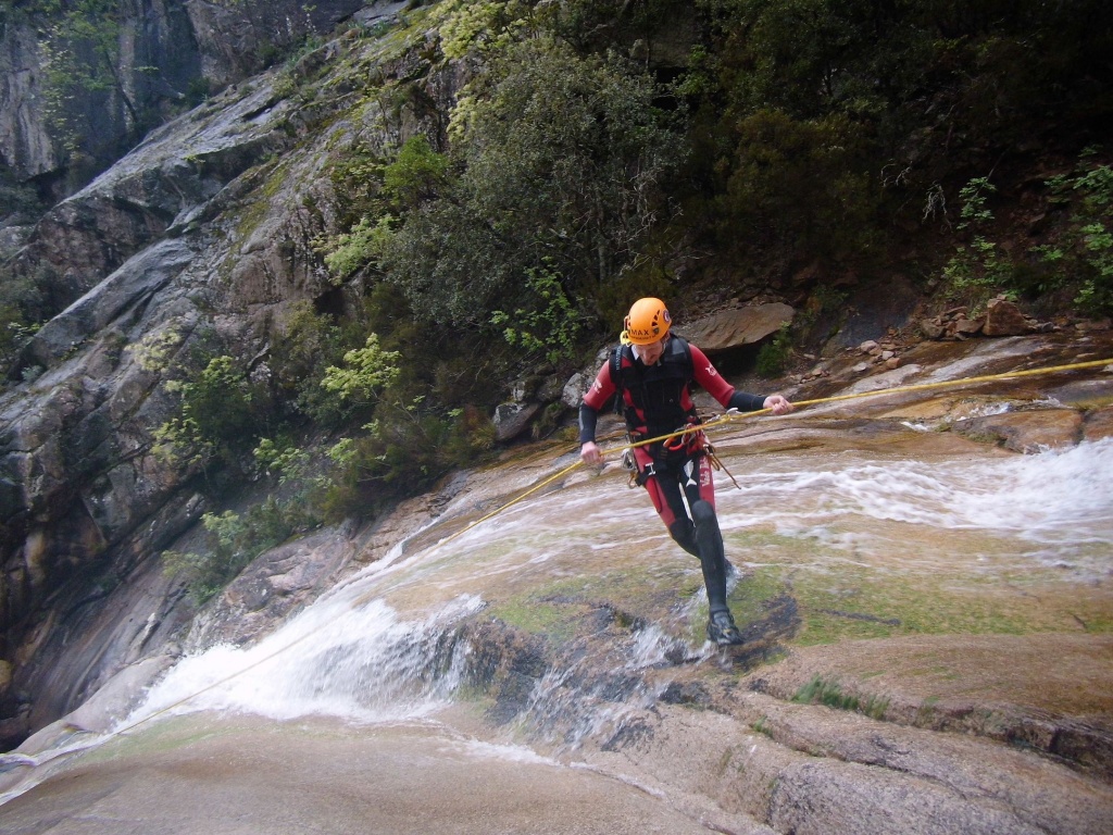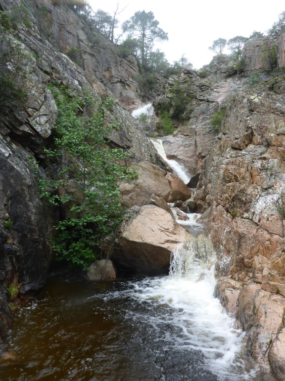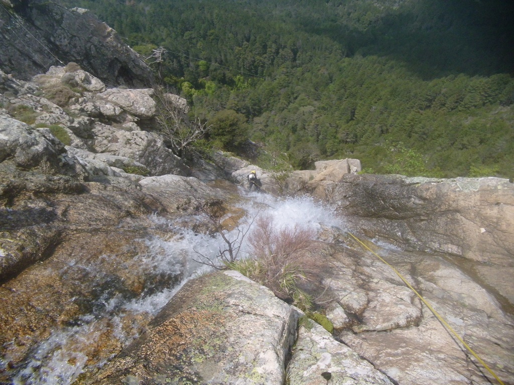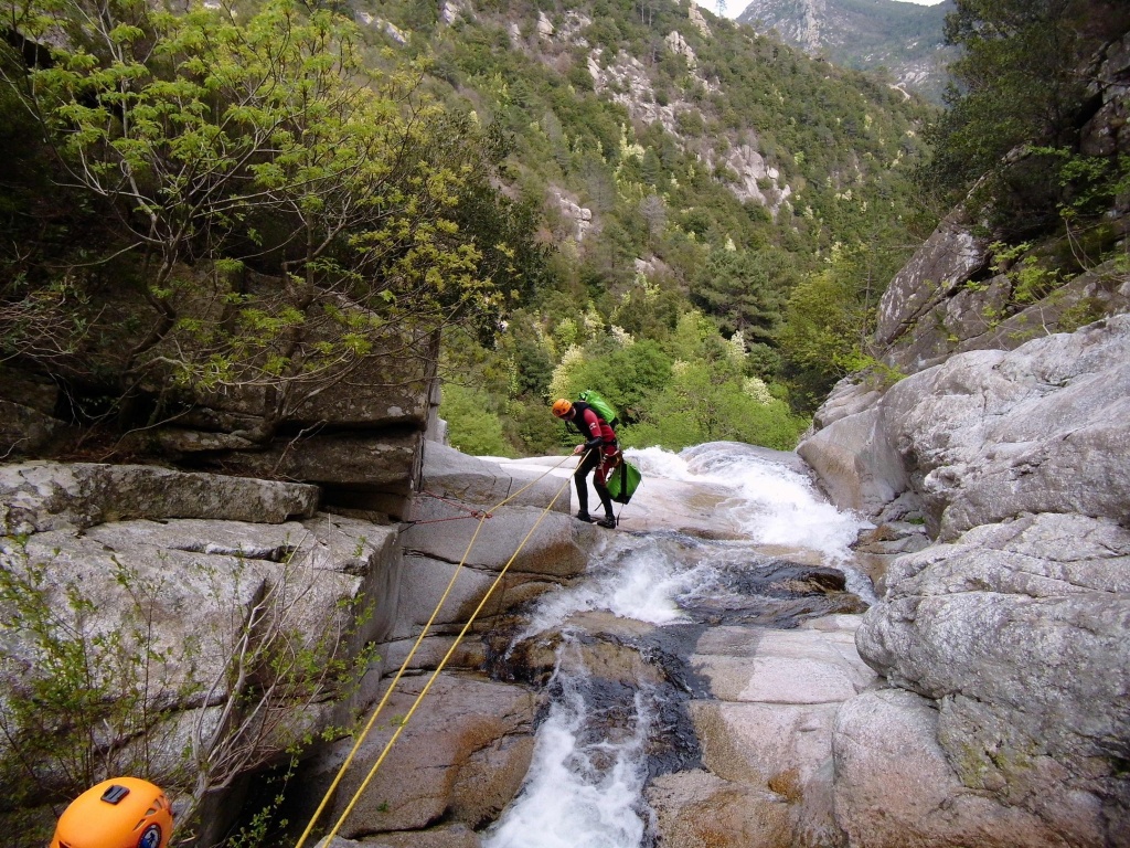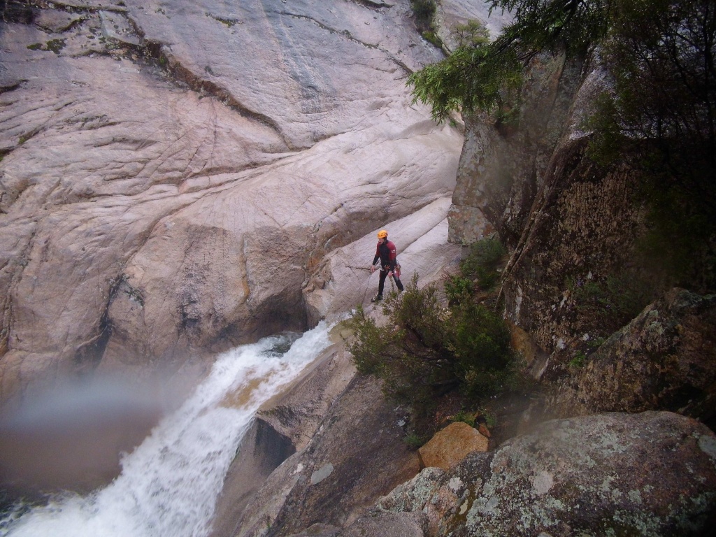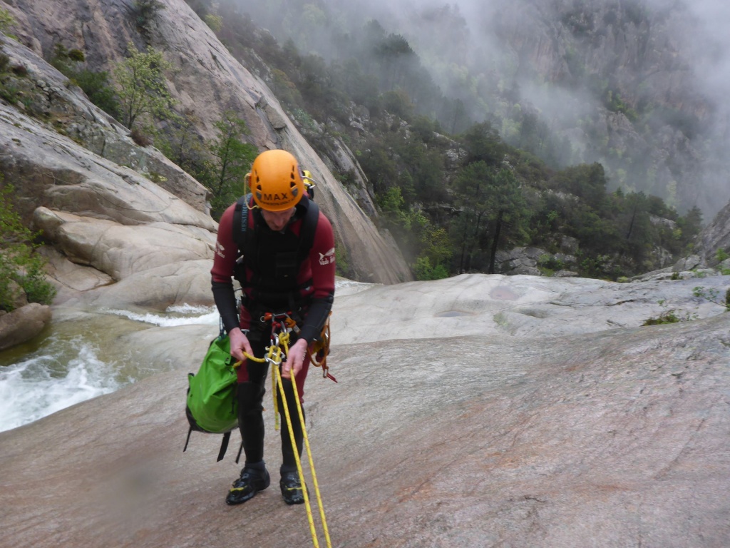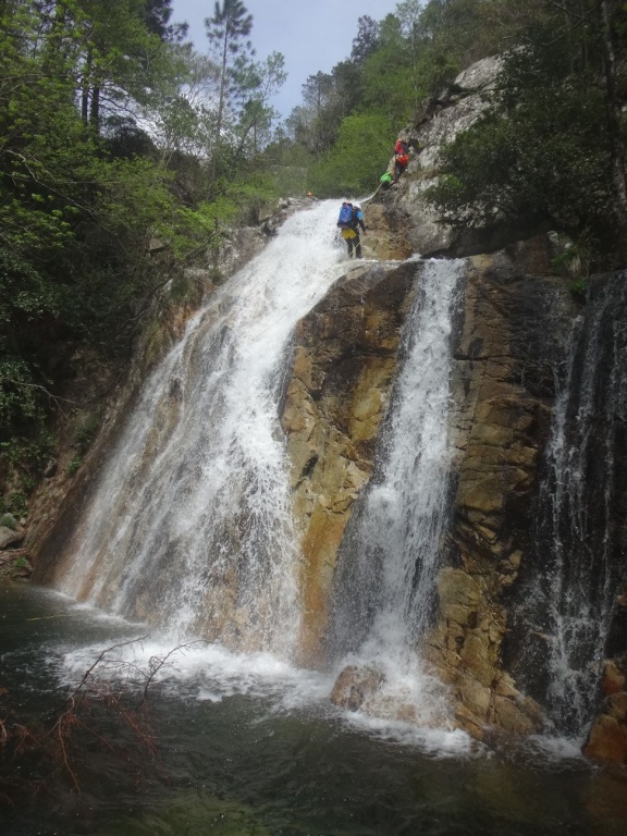 Dieser Bach hat sich in Angesicht der Wetterlage (Frühling + Regen = Viel Wasser) als richtige Auswahl herausgestellt. Im Sommer wahrscheinlich eine fast trockene Abseilpiste haben wir hier (meist) herrliches Canyoning genossen. Man fährt über den Bavella Pass und dann auf der anderen Seite bei einer Aussichtsplattform ist der Einstieg. Beim ersten Abseiler (Abseilstand nicht gefunden, Baum benützt) hätte sich ein 60m Seil ausgezahlt. Ich bin nach 50m in einem Baum/Gestrüpp/Stacheln gehängt um den zweiten Stand zu machen, 5m darunter war ein schönes Plato. Danach geht es Schlag auf Schlag eine tolle Abseilpiste, meist zwei Bohrhaken mit einem Schlingerl verbunden, manche davon haben wir getauscht. Später dann wird es etwas moosiger bis man dann auch schon den Riesensteinmann findet und der Ausstieg naht. Vom Steinmann quert man dann den kleineren Steinmännern folgend in einen zweiten Bach. Dort wussten wir dann nicht mehr weiter und wir sind dem Bach gefolgt und später dann mühselig durch die Stacheln einen steilen Hang hinaufgeklettert bevor wir durch den Wald nach einer gefühlten Ewigkeit den Feldweg erreichten. Richtigerweise hätten wir im 2. Bach sofort den Feldweg laut Karte anpeilen sollen, der dort wahrscheinlich bereits nach 5min Busch erreichbar gewesen wäre.
