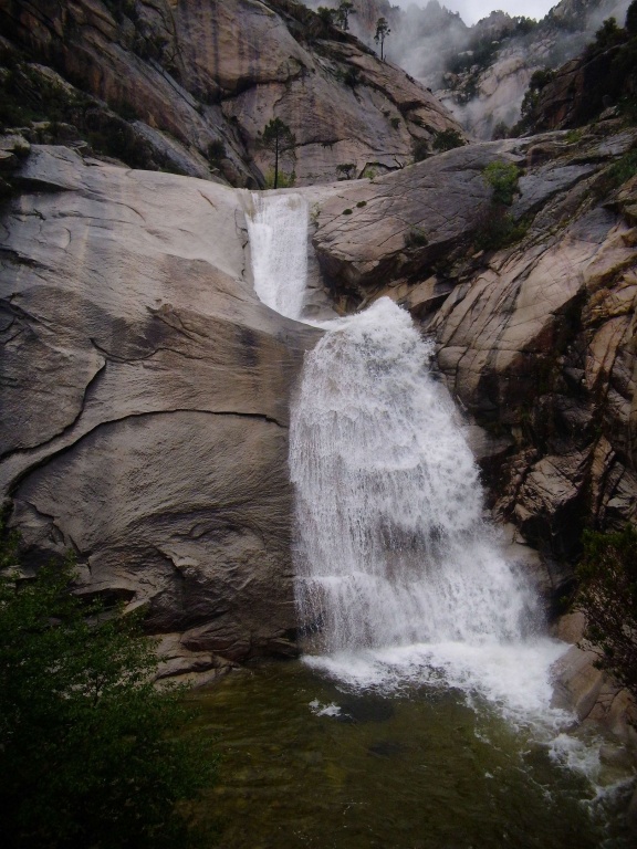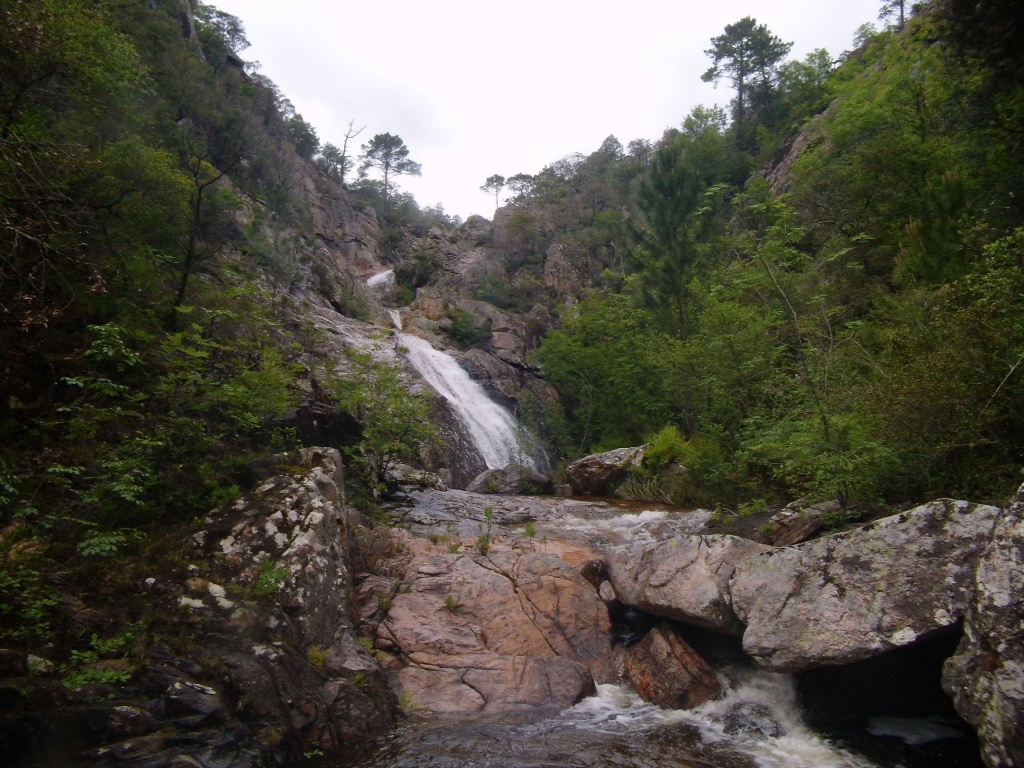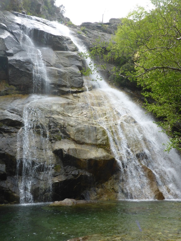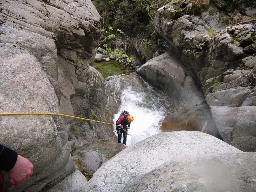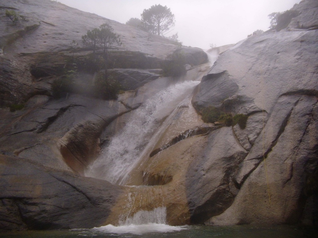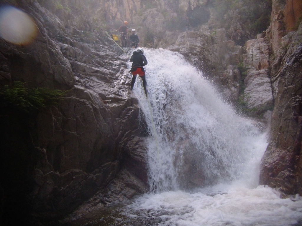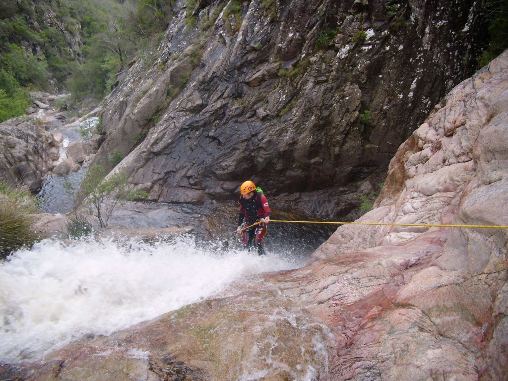 Dieser Bach hat sich in Angesicht der Wetterlage (Frühling + Regen = Viel Wasser) als richtige Auswahl herausgestellt. Im Sommer wahrscheinlich eine fast trockene Abseilpiste haben wir hier (meist) herrliches Canyoning genossen. Man fährt über den Bavella Pass und dann auf der anderen Seite bei einer Aussichtsplattform ist der Einstieg. Beim ersten Abseiler (Abseilstand nicht gefunden, Baum benützt) hätte sich ein 60m Seil ausgezahlt. Ich bin nach 50m in einem Baum/Gestrüpp/Stacheln gehängt um den zweiten Stand zu machen, 5m darunter war ein schönes Plato. Danach geht es Schlag auf Schlag eine tolle Abseilpiste, meist zwei Bohrhaken mit einem Schlingerl verbunden, manche davon haben wir getauscht. Später dann wird es etwas moosiger bis man dann auch schon den Riesensteinmann findet und der Ausstieg naht. Vom Steinmann quert man dann den kleineren Steinmännern folgend in einen zweiten Bach. Dort wussten wir dann nicht mehr weiter und wir sind dem Bach gefolgt und später dann mühselig durch die Stacheln einen steilen Hang hinaufgeklettert bevor wir durch den Wald nach einer gefühlten Ewigkeit den Feldweg erreichten. Richtigerweise hätten wir im 2. Bach sofort den Feldweg laut Karte anpeilen sollen, der dort wahrscheinlich bereits nach 5min Busch erreichbar gewesen wäre.