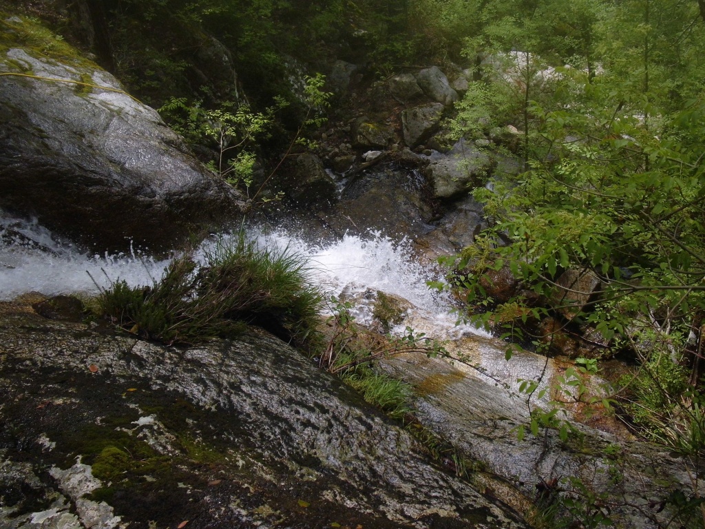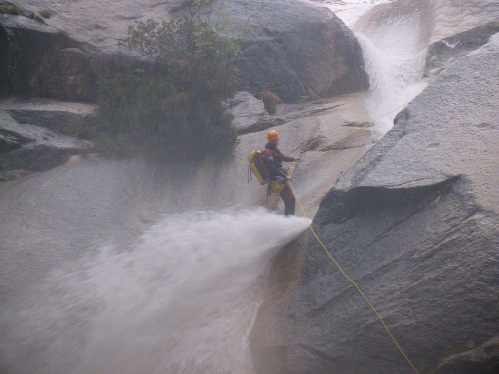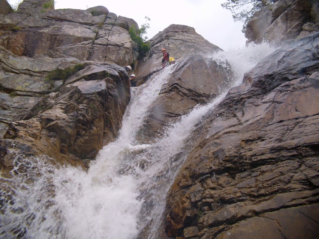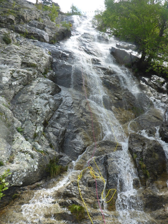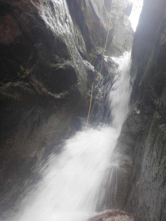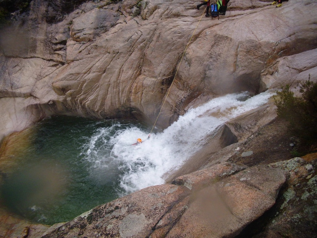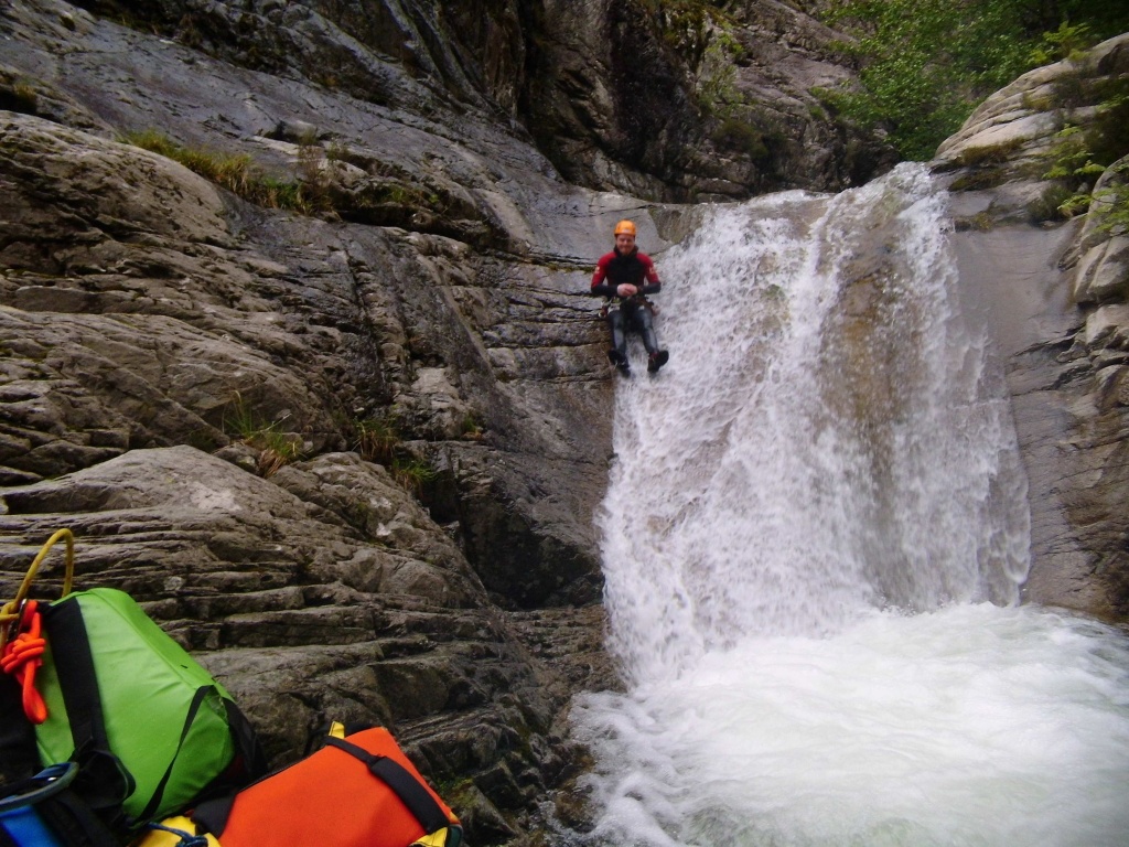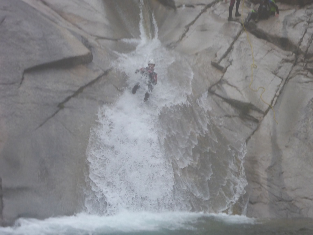 Nachdem wir bei dem ersten Mal weniger Leute waren und wir was verloren hatten und der Wasserstand wesentlich niedriger war und die Tour ruhig öfter gegangen werden kann haben wir uns nochmals aufgemacht den Purcaraccia zu besuchen. Im Vergleich zum ersten Mal hatten wir nur etwa halb soviel Wasser und wir haben diesmal von ganz oben gestartet. Beim Zustieg im letzten Teil war es ganz schön glitschig nass, hier aufpassen, einige von uns sind ausgerutscht, zum Glück ist keiner hinuntergefallen. Bei den großen Abseilern bin ich diesmal durch Wasser gegangen, einmal mit Rucksack was ich so nicht mehr machen werde. Auch den Mittelteil konnten wir diesmal bewältigen, auch wenn ich einen der Stände in diesem Bereich doch etwas außerhalb der Wasserführung gewählt habe. Die verlorene Rolle konnten wir leider trotz intensiver Bemühungen nicht mehr finden, es war einfach zuviel Weißwasser.
