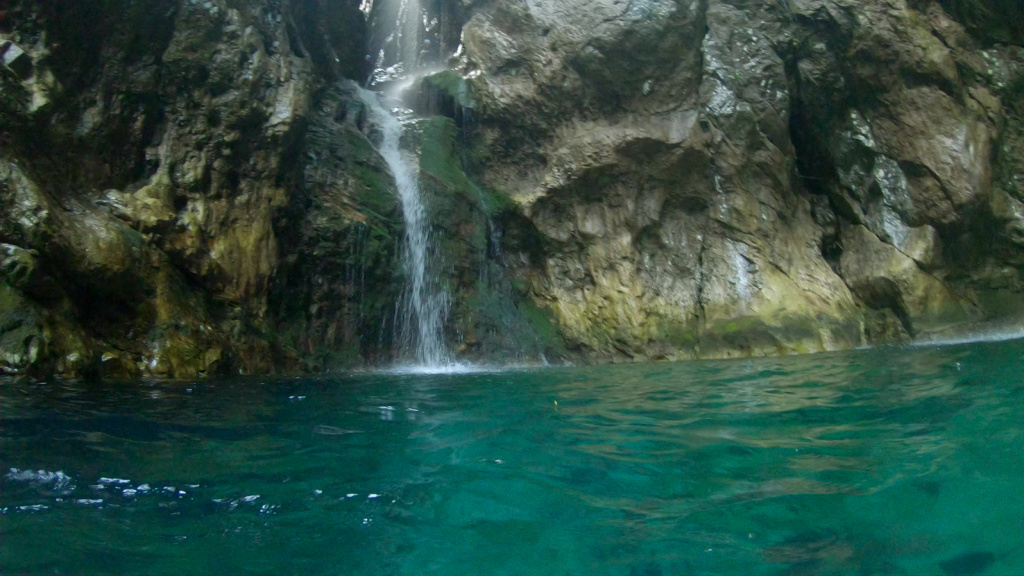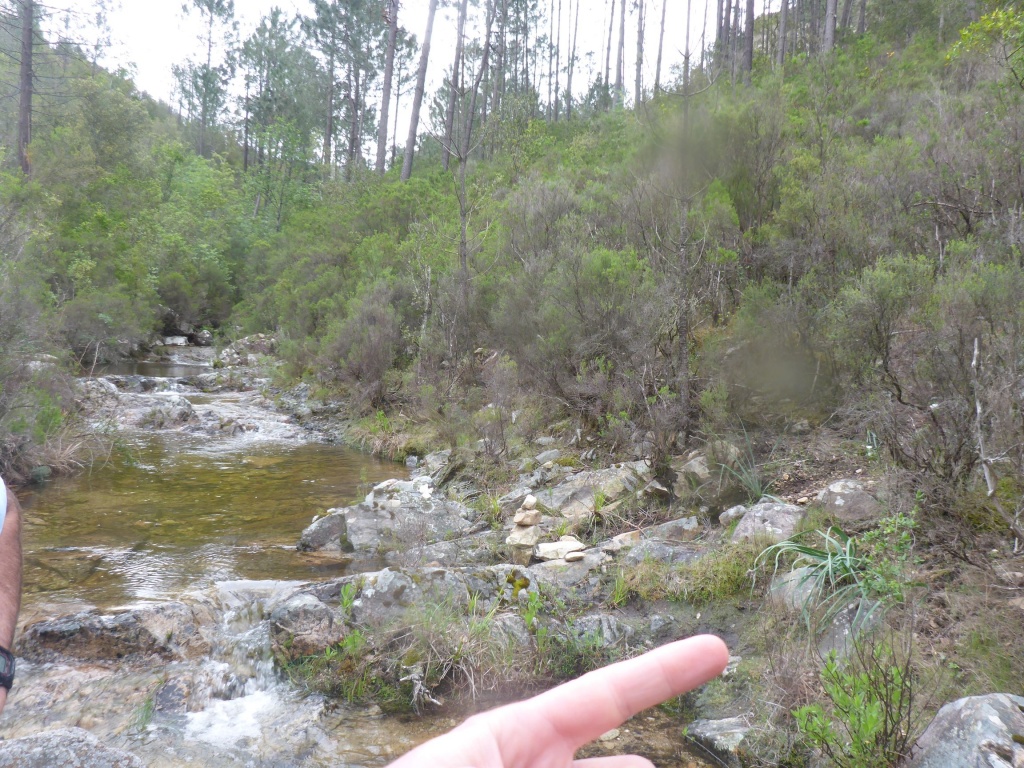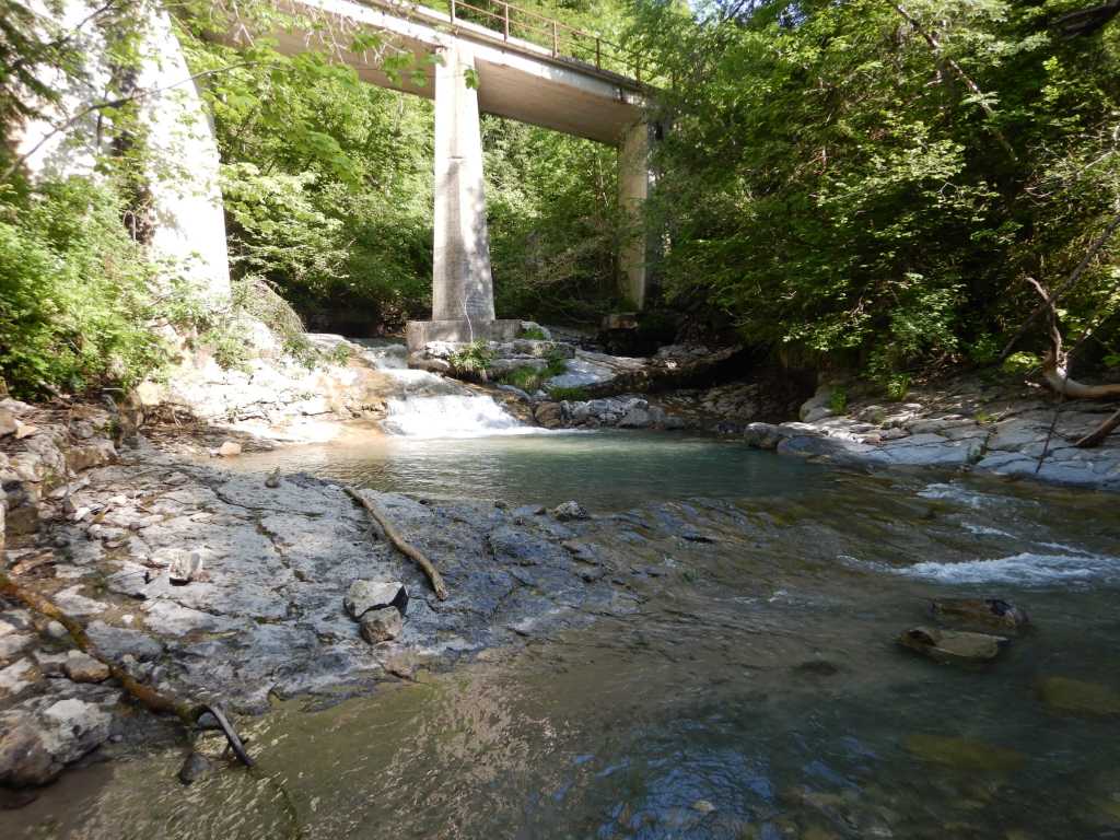 Den Zustieg haben wir trotz Infos/Karte/GPS nicht so gefunden wir es sein sollte und unser Auto wollten wir nicht auf der ausgespülten Schotterstraße verwenden. Eventuell ist die Straße zum hochfahren eine Option mit Autoumstellen was den Bach interessanter machen könnte. So sind wir der Straße folgend hoch gelaufen, den Bach zu finden war kein Problem. Allerdings standen wir im Bach in einer Art grün-braunen Sauce, die Steine waren dementsprechend glitschig. 100m später kam auch schon das Highlight, ein 50er Wasserfall an etwas spärlicher Bohrung. Danach wars dann quasi fast nur noch Gelatsche, nicht empfehlenswert außer für „Sammler“.