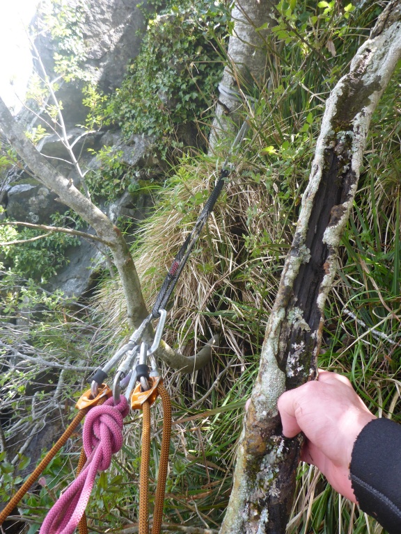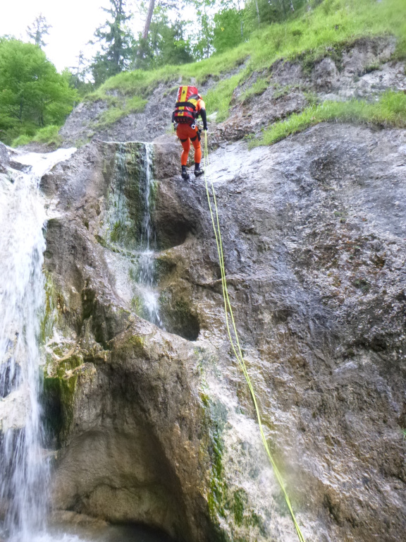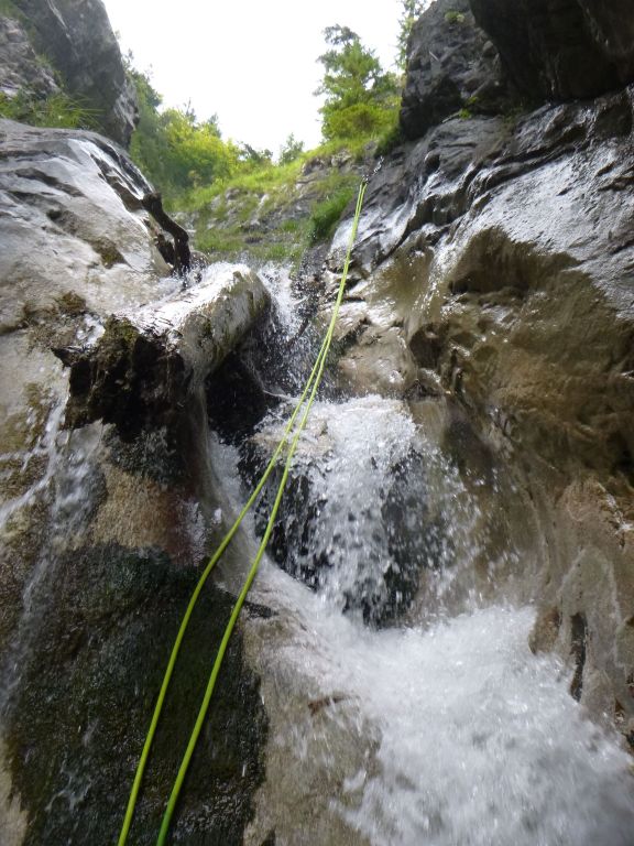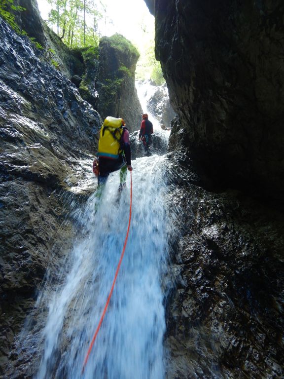 Die gewählte Abschlußtour hatte wie schon beim Zustieg erkennbar einen erhöhten Wasserstand. Leider hatten wir auch nicht sehr genaue Informationen wie die Tour aussehen wird, die meisten Details kamen von Fotos, wo wir aber nicht genau wussten wie viel Wasser diese Stellen wirklich vertragen würden. Wir ließen uns aber nicht unterkriegen und nachdem ein Rückzug zu Beginn immer möglich erschien stiegen wir in den Canyon ein. Beim ersten Abseiler hatten wir bereits eine Seilbahn in Verwendung, es folgte Abseilen vom Gebüsch außerhalb des Hauptwassers. In dieser Tonart ging es weiter aber wir waren guter Dinge bis wir eine Kante erreichten. Dort vom Stand hinunterblickend sahen wir, dass sich das gesamte Wasser der Tour in dieser einen Rinne konzentriert. Damit hatten wir die Alternative von einem Baum orthografisch links über eine scharfe Kante abzuseilen (und zu hoffen, dass die zwei weiteren erwarteten Rinnen besser aussehen) oder versuchen die Tour zu verlassen. Wir haben uns dann für letzteres entschieden und sind (bis auf die ersten beiden Abseiler) alle Stellen wieder zurück hinauf geklettert. Danach konnten wir den Bach orthografisch links über moosige lockere Felsbrocken verlassen. In diesem Fall hatten wir Glück im Unglück, ein Auto hatte uns recht schnell aufgeladen uns so mussten wir die 2h nicht zu Fuß zum bereits überstellten Fahrzeug laufen.
