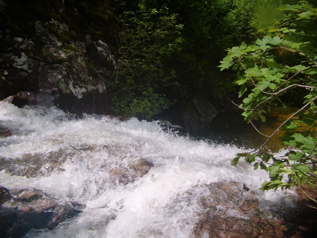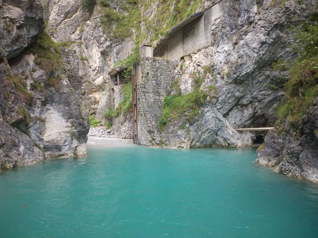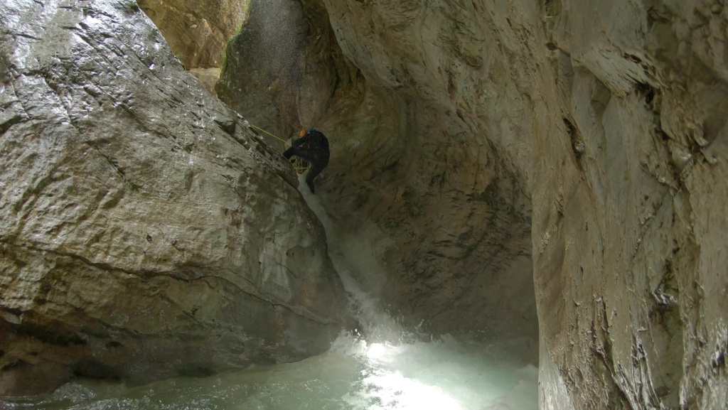 Ein schöner kurzer Canyon für zwischendurch, besonders wenn man den Zustieg von unten weiß. Hinter dem Kraftwerkshaus parken, dann der Leitung folgend nach oben und dann dem Weg nach links folgen. Nach der ersten Brücke über die Ableitung geht es ein paar Minuten später (noch vor der nächsten Brücke) links in den Wald hoch (Blaue Punkte auf weißem Grund sind sichtbar). Oben auf dem Grad geht man dann nach rechts dem Grad folgend, bevor man nach etwa 10min wieder nach links runter in die Schlucht geht. Markierungen sind überall vorhanden, man muss sie nur etwas suchen. Tour startet mit einem hohen Abseiler (30-40m), danach folgen einige kleinere Pools sowie frisches Geröll von links. Es folgen einige Engstellen und kleiner Abseiler und kurz danach ist man wieder unten draußen. Wasserstand kann man von unten im ersten Pool ums Eck erkennen, wenn der Pool zu groß ist, dann nicht einsteigen. Aktuell ist mir nicht ganz klar welches Kraftwerk in den Canyon ableitet, die Staumauer darüber kann es kaum sein, da hier der Zufluss komplett voll Moos war. Ggf. findet keine Ableitung statt und nur wenn der Bach Hochwasser hat, schiebt er die Steine etc. durch, könnte sein, aber bin mir nicht sicher. Gesamtdauer etwa 30min Zustieg, 2-3h Tour, kein Rückweg.