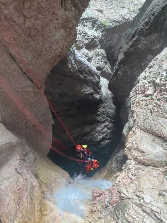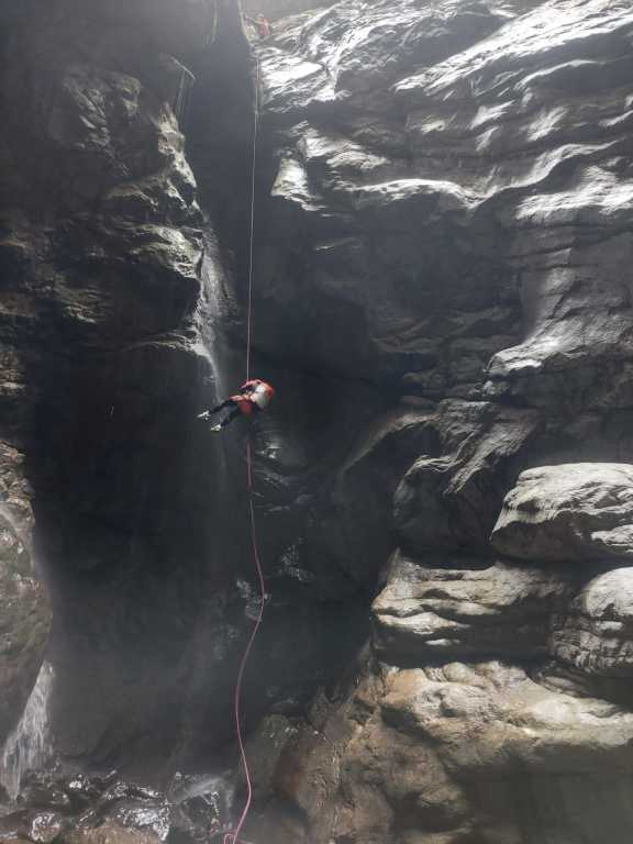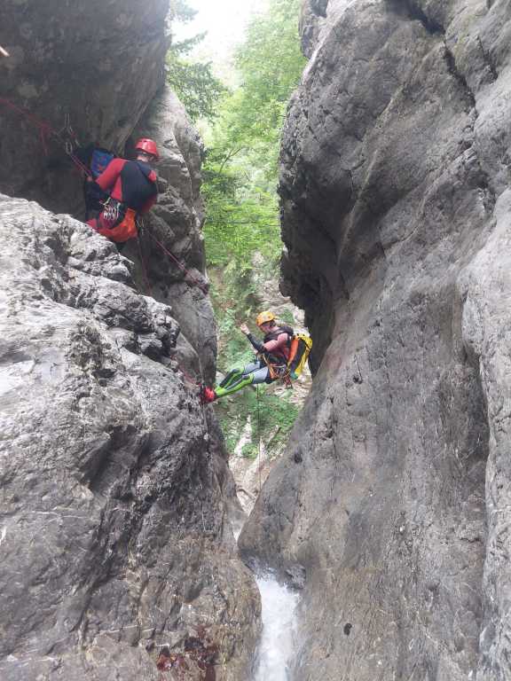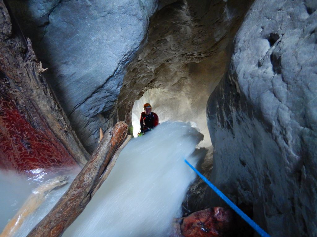 Die Vinadia ist eine der längsten Schluchten in der Umgebung. Anfahrt erfolgt mit dem Auto und beim Einseilen in die Schlucht hatten wir aufgrund einiger Eisenteile bereits die ersten kleinen Verletzungen. Es folgt wandern im Bach, bevor man zu ersten Stellen kommt und von einer Baumarktkette am Baum abseilt. Es folgen ein paar schöne Stufen und die Erinnerung, dass man einen Seil-Umlenker besser nicht als Standplatz verwenden sollte sowie Geländerseil und Abstiegsseil immer separat fixiert sein sollten und man die Selbstsicherung nicht ganz kurz direkt im Gurt nehmen sollte. Es folgen keine technisch schwierigen Stellen und auch keine mit viel Wasserdruck,, aber wir sind doch viel unterwegs. Gerade das Abklettern raubt mir die Kräfte, welche durch den Durchfall nach dem Frühstück noch zusätzlich reduziert wurden. Die Gruppe passt aber gut auf mich auf, ich bekomme das Mädchenseil, extra Riegel und extra Getränke und so ist es bis zum Ende kein Problem. Apropos Getränke, das Schlucht-Wasser würde ich nicht trinken, manchmal kommt von der Seite ein Rinnsal rein, aber die meiste Zeit über wird das Mitgebrachte benötigt. In etwa der Mitte des Canyons kommt man zu einer Geschiebesperre mit Tunnel auf beiden Seiten. Angeblich kann man dem Tunnel orthografisch links als Notausstieg aus der Schlucht folgen (Stirnlampe), wobei ich niemanden direkt kenne, der den Tunnel schon einmal probiert hat. Es gibt immer wieder schöne Einzelstellen, dazwischen Gelatsche, teilweise etwas offen, teilweise richtig toll eingeschnitten. Die Hakensituation ist aktuell gut, viele wurden scheinbar gerade erst hergerichtet und einige haben wir noch hinzugefügt. Nach etwa 6-7h verlassen wir wieder die Schlucht, wobei wir als Gruppe ziemlich schnell waren. Früh zu starten, macht bei der Tour definitiv Sinn.