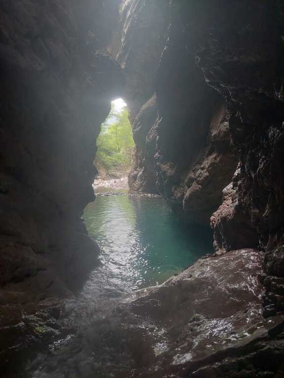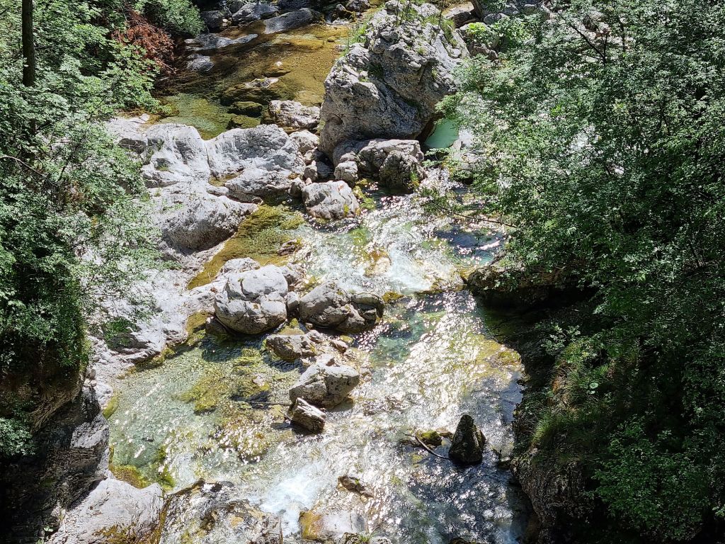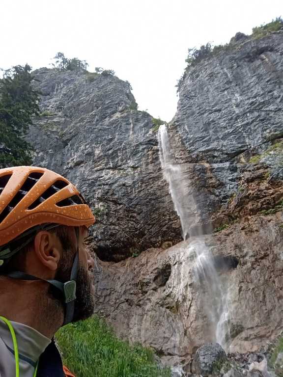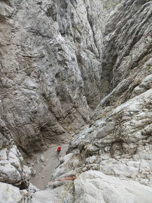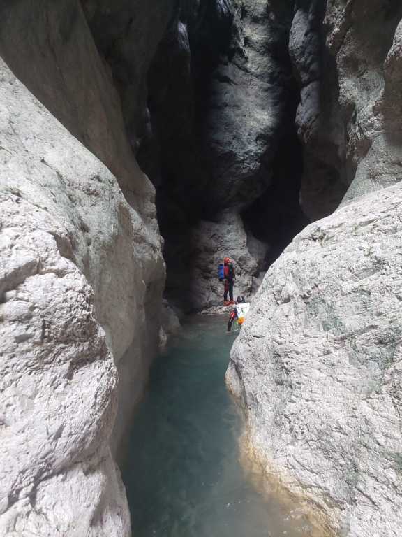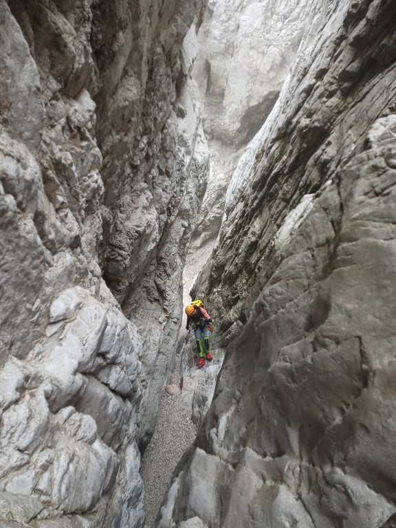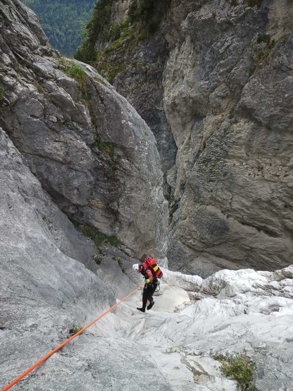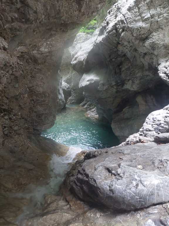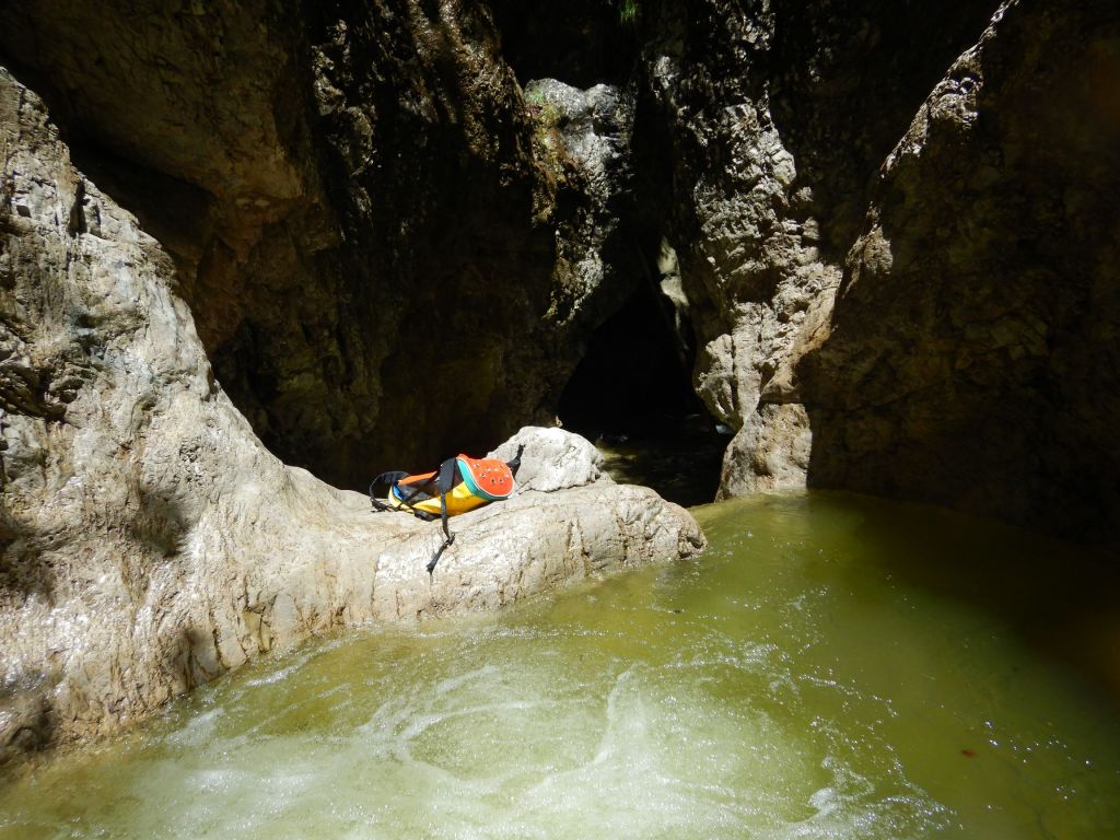 Eine der Top-Touren in Friaul, aber von Kondition und Zeit her nicht zu unterschätzen. Die Anfahrt über den Passo Rest ist von unserer Base Nähe Venzone aus nicht optimal gewesen, die Strecke von der anderen Seite ist zwar länger, aber genauso schnell und eben und nicht kurvig. Wir sind (nachdem ich den Bach noch nicht gekannt habe) diesmal „nur“ den Teil 2 und 3 gegangen. Zustieg zuerst etwa eine Stunde bis zu Ausstieg von Teil 3, danach nochmals eine gute Stunde bis zum Einstieg von Teil 3 und dann nochmals eine gute halbe Stunde hoch zum Einstieg von Teil 2, wo aktuell ein Holzschild mit „Viellia 2“ angebracht war. Wir hatten viel Material und nasse Neoprens mit, der Zustieg war ganz schön fordernd, aber der letzte Teil wird dann flacher. Zu Beginn der Tour kann man nach dem Schild noch eine Stufe hochgehen und hat so einen tollen 4-5m Einstiegssprung ins kalte Wasser (Gehirnfrost!). Es folgend im zweiten Teil viele Sprünge, zuerst kleinere, dann ein 8-10m Trainingsprung wo man einfach wieder raufklettern kann, bevor es zu dem 15m Sprung geht. Es ist kurzweilig, es folgen ein paar Abseiler bis man wieder in einem offenen Teil ist, dem Anfang von Teil 3. Es folgt etwas Bachgelatsche und danach hatten wir kein Frischwasser mehr. Wahrscheinlich wegen der generellen Trockenheit dieses Jahr und weil es seit einigen Tagen nicht mehr geregnet hatte auf alle Fälle, der Einstiegswasserfall mit dem Loch orthografisch links war trocken, der Pool dahinter mit Wasser gefüllt, aber etwas abgestanden und algig. Kurz danach kam dann aber wieder Wasser dazu und so hatten wir z.B. beim nachfolgenden 6m Sprung wieder genug und schönes Wasser. Vorsicht dort, wenn man springt nicht zu weit nach vorne hüpfen und beim Rutschen hatte es mich verdreht. Etwas später folgt die wohl schönste Einzelstelle in Friaul, zuerst der etwa 25m Abseiler in den Spalt und dann der etwa 10m Sprung in den tollen „Olympia“-Pool. Vorsicht beim Sprung, in unserem Fall war es extrem rutschig, wir hatten Glück! Danach folgen noch ein paar Einzelstellen, aber nichts Spektakuläres mehr und danach erreicht man wieder den Wanderweg vom Aufstieg. Von hier geht es ca. 45min zurück zum Auto. Ich hatte es barfuß in gewaschenen Neoprenschuhen versucht, was mir einige offene Stellen beschert hat, besser Wandersocken mitnehmen oder in den Neoprensocken bleiben. Wir waren auch gefühlt 1-2h zu spät dran, also etwa 10Uhr am Parkplatz, 13Uhr im Bach, 17Uhr Olympiapool und 19Uhr unterwegs zurück.