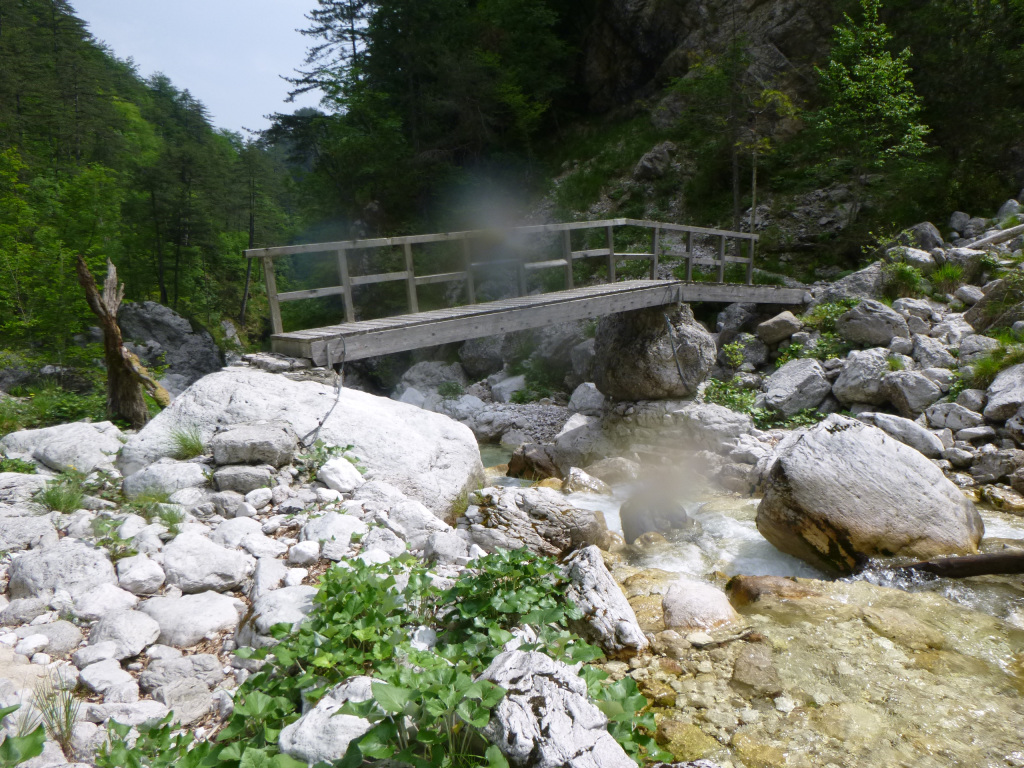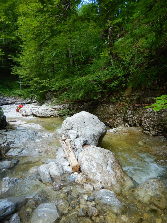 Schon lange wollte ich den Rio Nero im Resi-Tal (Val Resia) gehen. Diesmal war es so weit. Wir parkten nicht wie beschrieben nach Tal-Anfang etwa 3,5km auf dem großen Parkplatz links, sondern etwas weiter vorher rechts unten am Fluss. Man muss allerdings bedenken, dass nicht jedes Auto von dort aus wieder hochkommt, so hatte z.B. das Wohnmobil, welches wir beobachten konnten, sichtlich Probleme. Auch die beschriebenen Holzbrücken existieren nicht mehr, wir sind einfach durch den Bach gegangen und sind einem Schotterweg folgend bis zum Wanderweg 703 gegangen. Den Wanderweg dann hochgegangen bis zur Brücke. Der Bach hatte, wie wir dort waren, doch Wasser, aber die Stellen vertragen durchaus auch die doppelte Wassermenge. Schlüsselstelle meiner Meinung nach ist die Stelle, wo es ums Eck geht in der Mitte, dort könnte es mit viel Wasser ganz schön ungemütlich werden. Hakensituation ist ausreichend, wobei an der einen oder anderen Stelle nachgebessert werden könnte. Bei manchen Stellen gibt es auch Umlenker, so z.B. beim 13m Sprung welchen wir als etwas ungünstige Absprungstelle gewählt hatten. Die Tour hat schöne Einzelstellen, aber dazwischen ist viel Gelatsche und Abkletterei. Gesamtdauer im Bach für uns war etwa 5h, Zustieg eine Stunde, Rückweg 20min.