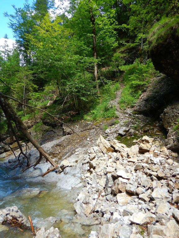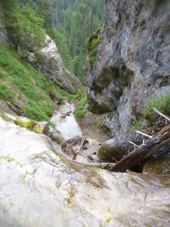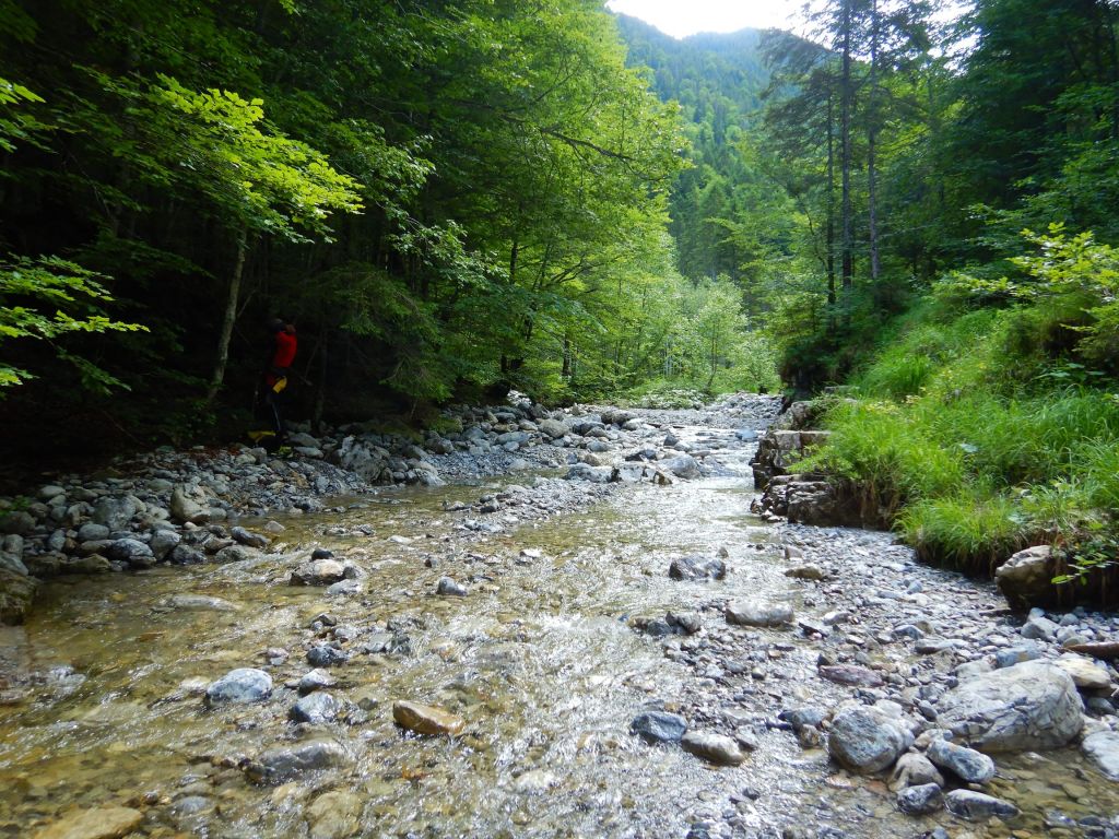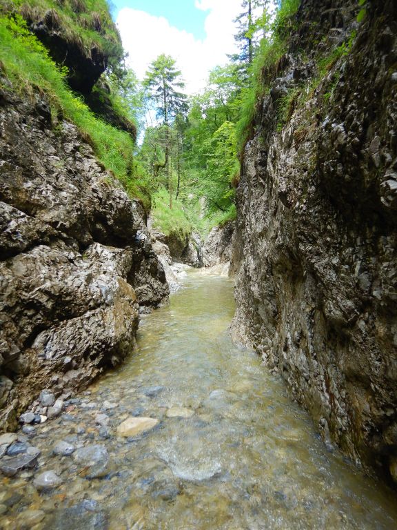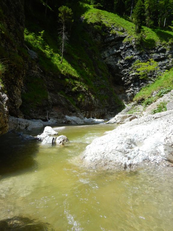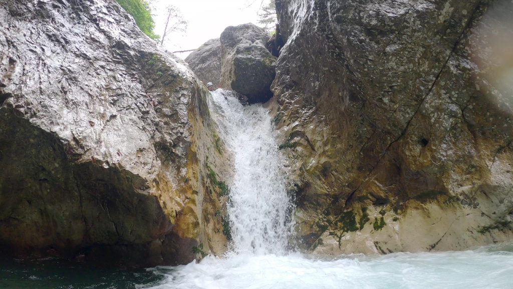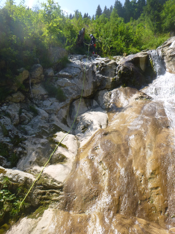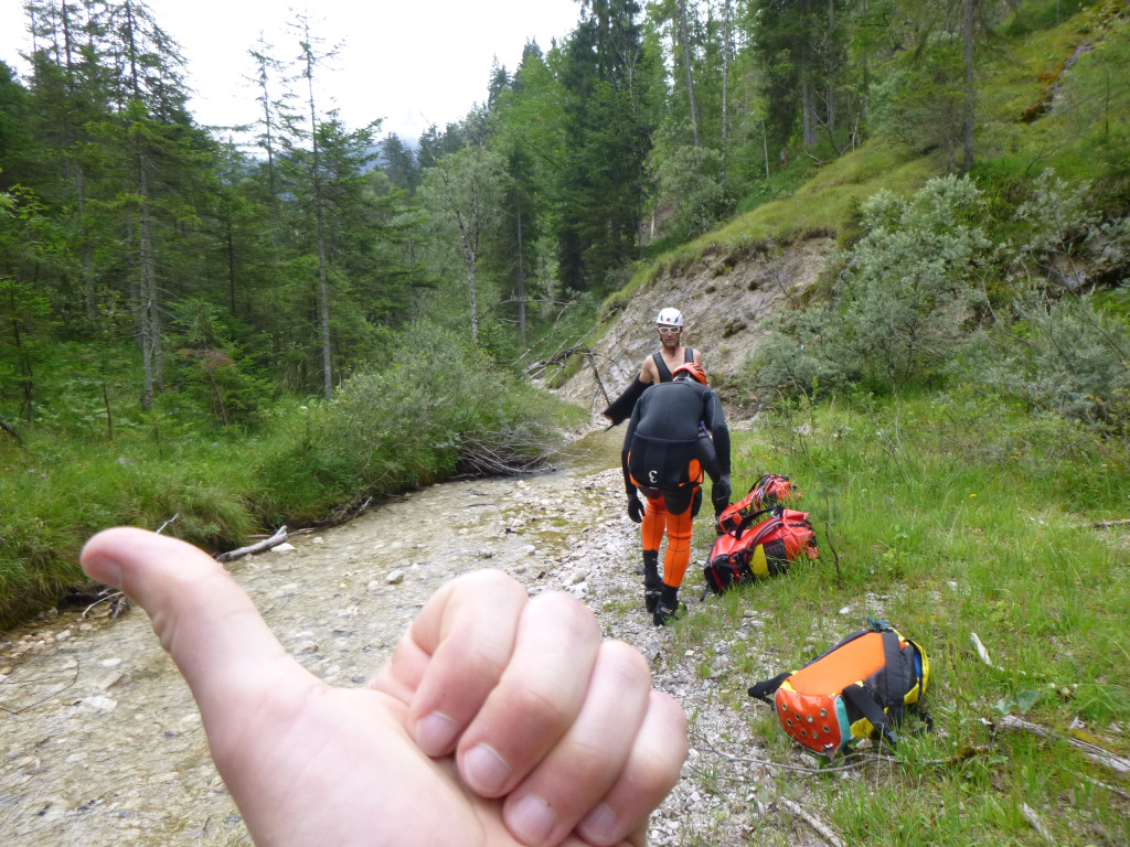 Der Zustieg war einfach zu finden und zum Schluss etwas steil bergab und leicht rutschig. Im Bach war dann doch gut Wasser. Nachdem wir zweimal „kreiseln“ mussten haben wir die weitere Tour gespottet und uns für einen Ausstieg entschieden. Entscheidung war richtig, Wasserstand im Laufe des Tages auch noch steigend.
