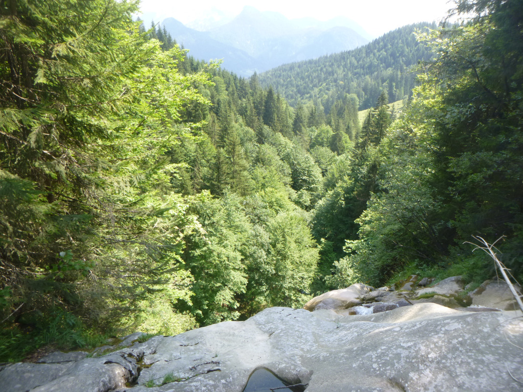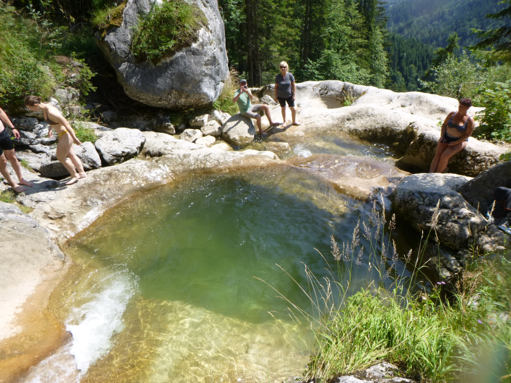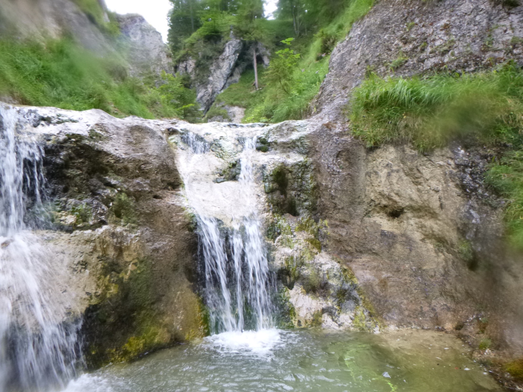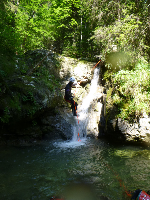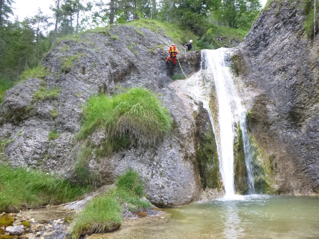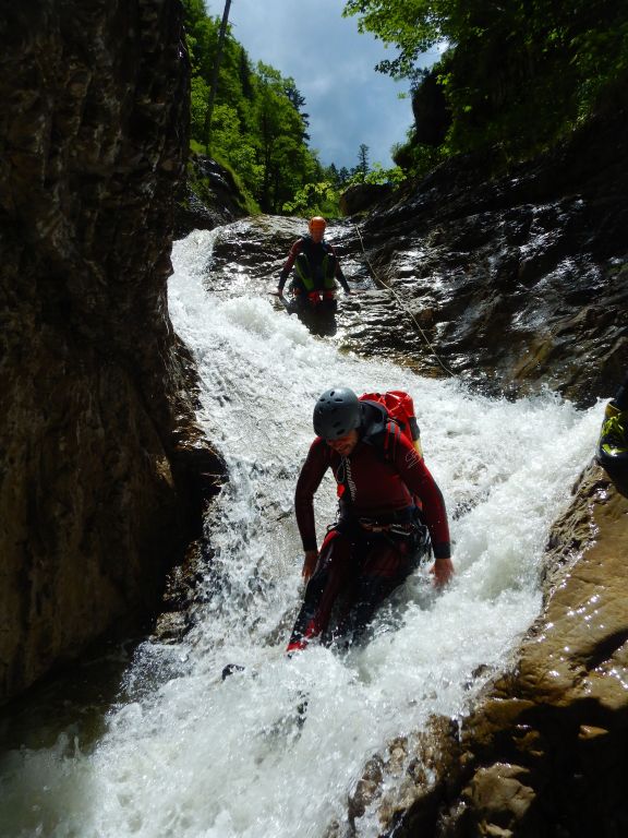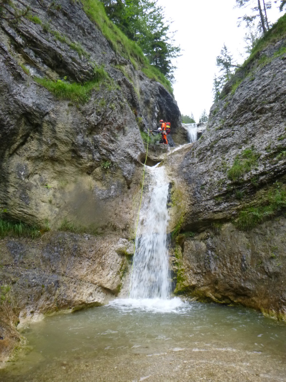 Der Pitzbach ist ein Seitenarm, der danach in den Hühnerbach mündet, wird wahrscheinlich zumeist in Kombination begangen und ist eine nette Halbtagestour. Zustieg 30-40min fast gleichmäßig ansteigen der Schotterstraße entlang. Sieht von den Fixseilen etc. so aus, als würde er (z.B. am WE) kommerziell begangen werden. Im Hühnerbach gibt es eine Möglichkeit vorher auszusteigen und damit einer potenziellen Strafe (Canyoning ist in Bayern verboten, es gab an der Stelle bereits Strafen) zu entgehen, gefühlter maßen würde ich das nur am WE in der Hochsaison machen, da es doch 10-15min steil bergauf bis zurück zum Schotterweg sind, aber das muss dann jeder für sich selbst entscheiden. Die Tour verträgt sicher viel Wasser, alle hohen Abseilstellen sind mit wenig bzw. sogar komplett außerhalb der Wasserführung machbar. Bei einigen kleineren Stellen könnte es interessanter werden, aber wir hatten mit dem Wasserstand (siehe Fotos) absolut keine Probleme, selbst bei doppeltem Wasserstand wäre es noch einfach möglich gewesen. Schlüsselstelle wahrscheinlich im unteren Teil nach dem Spielplatz, wo man einmal über den komprimierten Strahl muss. Zu Beginn gab es gleich eine potenzielle Rutsche oder Sprung, leider völlig zugekiest und daher nicht machbar. Die Tour danach ist relativ kurzweilig, wenig Gehgelände dazwischen und immer wieder Attraktionen. Wenn man dann in den Hühnerbach kommt, gibt es etwas Gehgelände, dafür kommt danach gleich die schönste Stelle der Tour. Ein etwas aquatischer Teil, auch eingeschnitten, aber mit tollen Pools etc. Man kann teilweise nochmal rauf gehen und nochmal rutschen/Springen etc. Wir hatten dort fast eine halbe Stunde „herumgespielt“. Danach ist es einiges an Gelatsche den Hühnerbach hinaus bis, wie oben beschrieben zum Ausstieg auf österreichischer Seite oder weiter im Bach.