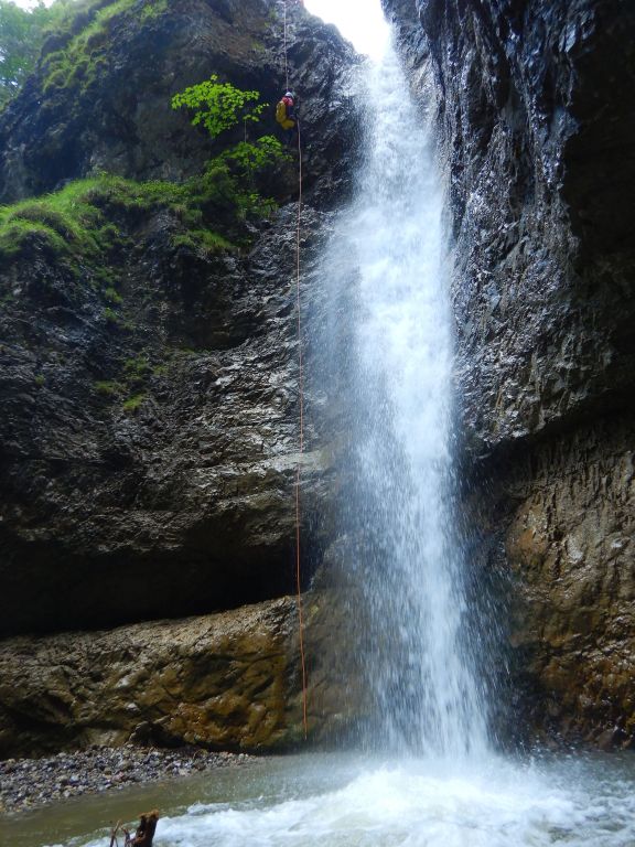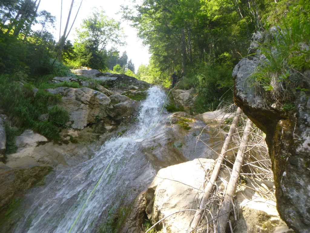 Auch dieser Bach war schon bekannt, diesmal mit etwas mehr Wasser als zuletzt hat er sich gerade am Schluss als dann doch „interessant“ herausgestellt. Beim Zustieg könnte es ggf. bei der Aussichtsstelle vor der Rechtskurve eine Möglichkeit geben in die Schlucht zu gelangen (möglicherweise Seilverwendung notwendig). Dann würde man sich das Bachgelatsche zu Beginn sparen was der tollen Schlucht etwas die Attraktivität nimmt. Am Ende gab es die Möglichkeit orthographisch rechts oben über den Baum abzuseilen und so dem Wasser etwas auszuweichen. Nichts desto trotz war schon etwas Wasserdruck vorhanden.