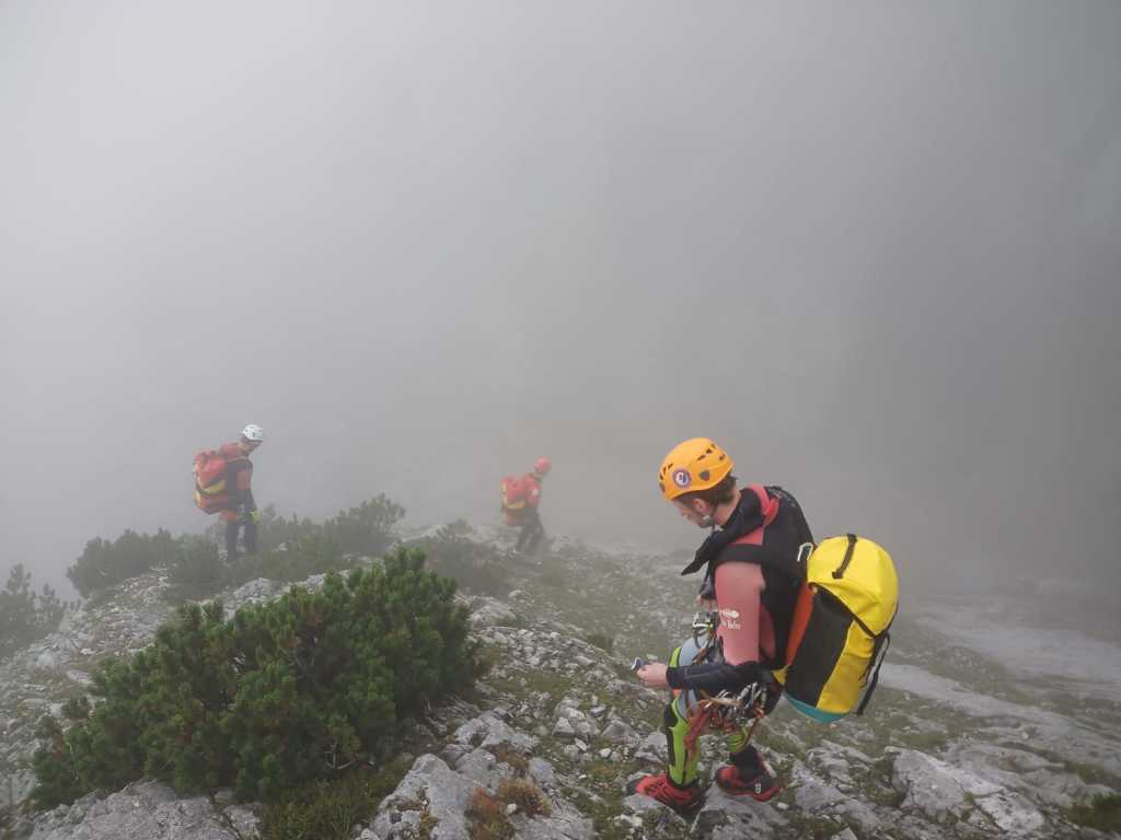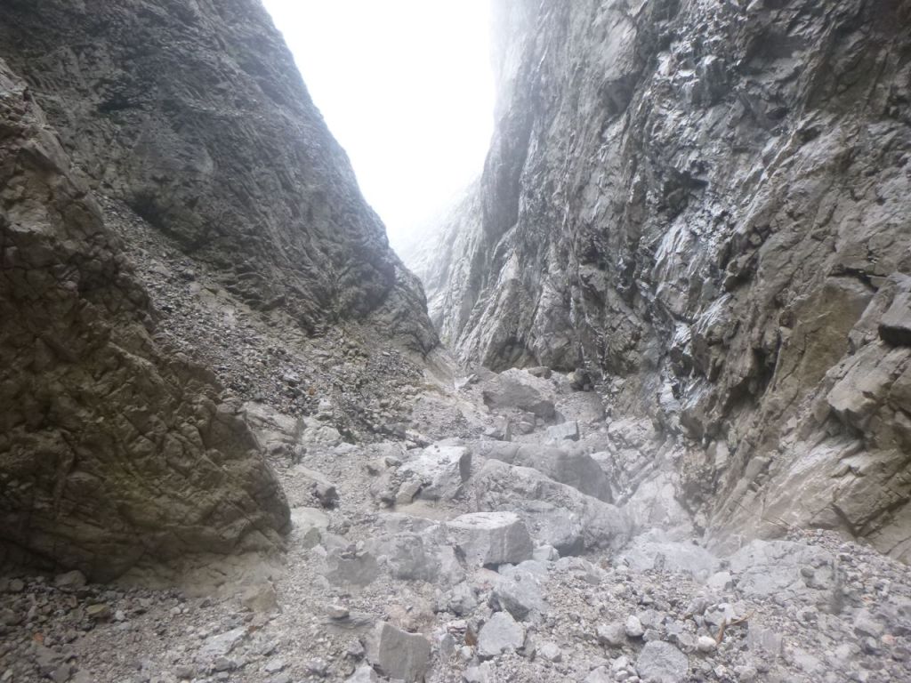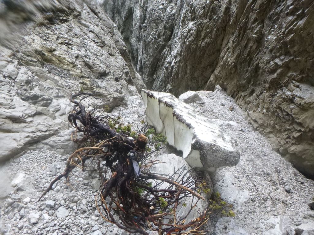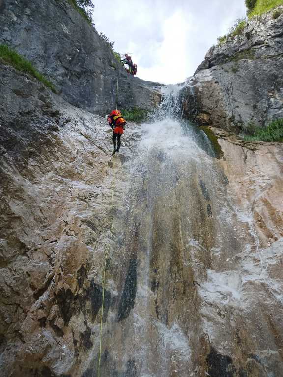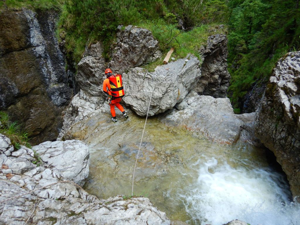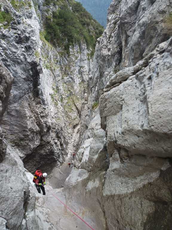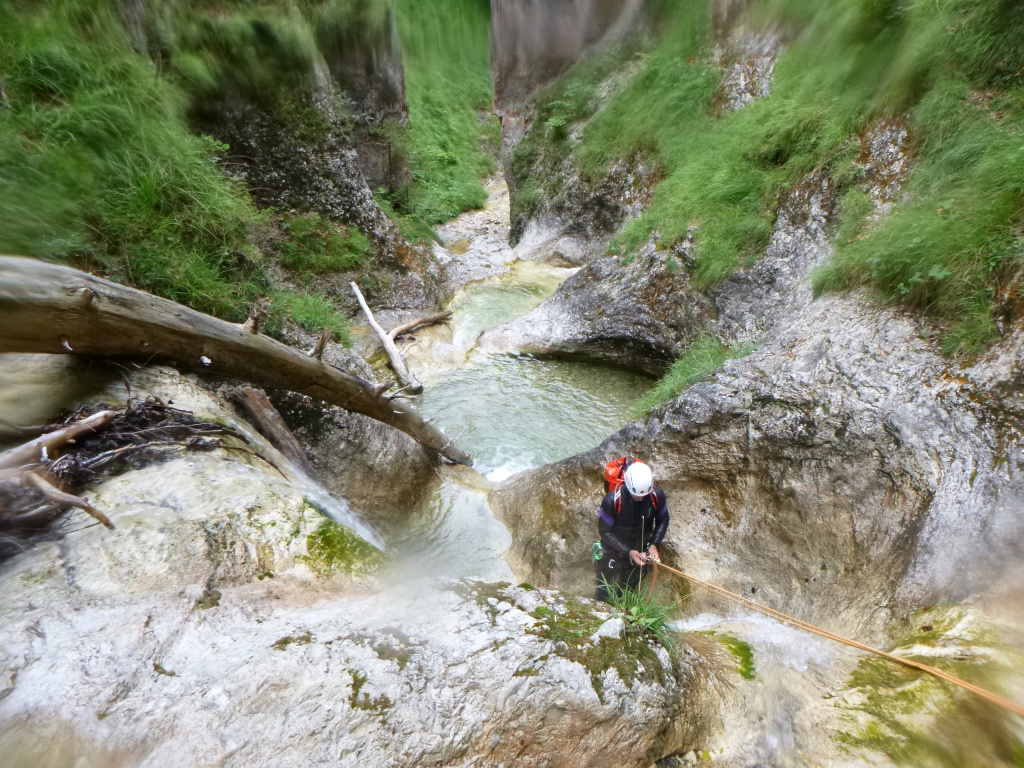 Der Canyon ist, wie die anderen auch, im Tiroler Standardwerk von Riml/Amor enthalten. Wir sind ihn von oben gegangen (Einstieg E), wobei wir uns das Hochklettern zum ersten großen Abseiler gespart hatten. Der Zustieg geht zuerst gemütlich einen Forstweg dahin, dann im Wald gemütlich hinauf bis auf eine Alm (wo es auch Wasser gibt). Danach geht es einen Wanderweg weiter, welchen man auf knapp 1700m nach links auf einem kleinen Steig ausquert. Wir hatten ein Handy dabei und festgestellt, dass der Steig auf dem Kartenmaterial der Alpen von https://www.openandromaps.org sogar eingezeichnet ist. Weglos durch die Latschen zu gehen, wäre an dieser Stelle nicht so lustig gewesen. Zustiegsdauer für uns war etwa zweieinhalb Stunden, wobei wir flott unterwegs waren. Einstieg in den Graben, nach einem zweiten Frühstück im Nebel, erfolgt mittels Abkletterei im 1-2 Grad. Man steht danach in einer Schotterrinne und los gehts. Die Standplätze bestehen meist aus Einzelhaken am Rand um vor dem Geschiebe geschützt zu sein, manchmal kann man zwei Stufen gemeinsam abseilen. Manchmal haben wir neue Haken gesetzt. Gesamt haben wir etwa 8 erneuert, einige davon quasi „notwendig“. Bei den hohen Abseilern gibt es meist zwei Haken, auch Klebehaken wurden gesichtet. Im unteren Teil ab E2 gibt es wesentlich mehr Wasser und hier sind die Stände gut eingerichtet, sieht nach kommerziellem Setup aus. Wasser im oberen Teil der Schlucht ist nur selten vorhanden. Es würde sich anbieten den Canyon direkt nach Regenfällen zu begehen, da müssten im oberen Teil viele der Tümpel gefüllt sein. Oftmals ist in der Tour Altschnee von den Lawinenkegeln enthalten, deshalb auch die Begehung erst im August. War aber aufgrund des generell warmen Sommers (und des wenigen Schnees im Winter) diesmal kein Thema. Der Charakter ist generell tief eingeschnittene schöne alpine Tour mit vielen, auch hohen Abseilern. Im unteren Teil kommt dann noch gut Wasser dazu und ein krönender Abseiler zum Schluss, soweit eine tolle Tour. Wir sind danach durch viele kleinere Verklausungen hindurch dem Canyon bis zum Vomper Bach gefolgt bis zu einer Wasserableitung/Kraftwerk. Dort ausgestiegen und wieder hoch zum Ausgangspunkt, Gasthaus Karwendelrast, gegangen. Sinnvoller (und wahrscheinlich weit weniger anstrengend) wäre gewesen, wie im Buch beschrieben nach dem letzten Wasserfall orthografisch links die Böschung hoch zu gehen, bis man wieder auf den Schotterweg kommt. So haben wir über eine Stunde am Schluss mit Bachbettlatschen verbracht. Abmarsch war um 8Uhr, wir waren beim Auto zurück um etwa 17:45, also mit zwei kleineren Pausen 12h unterwegs, nicht zu unterschätzen.