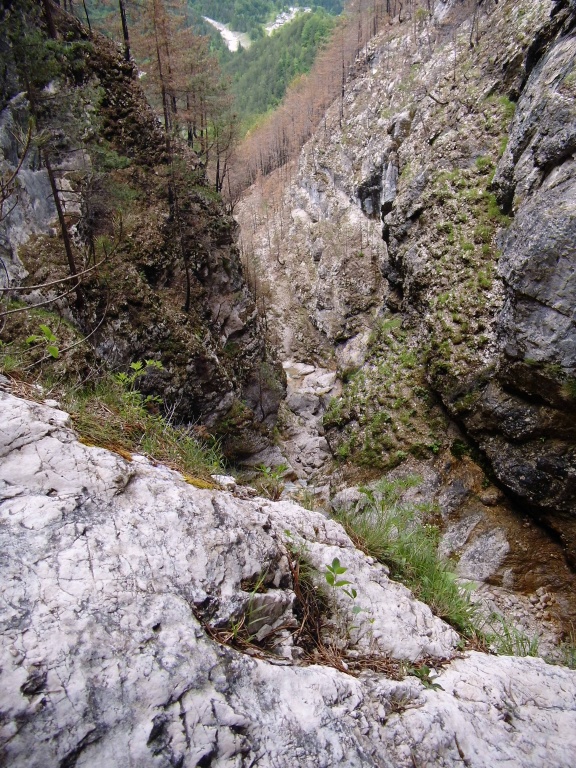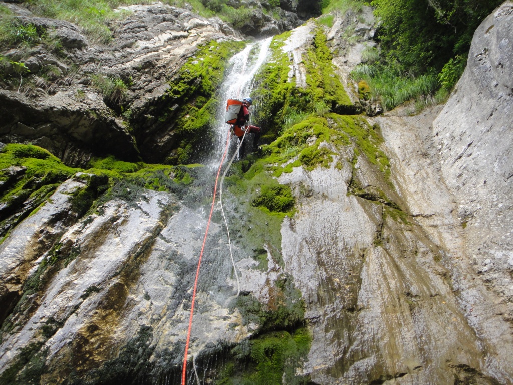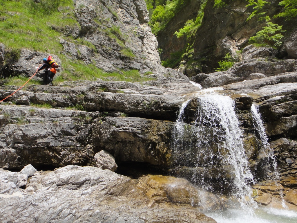 Orografisch linken Arm + Hauptschlucht begangen, Anfahrt im letzten Stück „interessant“, Stände im Seitenarm teilweise dürftig. Schlucht selbst lohnend. In Tour einmal scharfe Kante mit Umlenker, letzte Stände am besten mit 30/30/30m machbar, letzter Stand ist rechts etwas versteckt (einfach den Haken folgen).